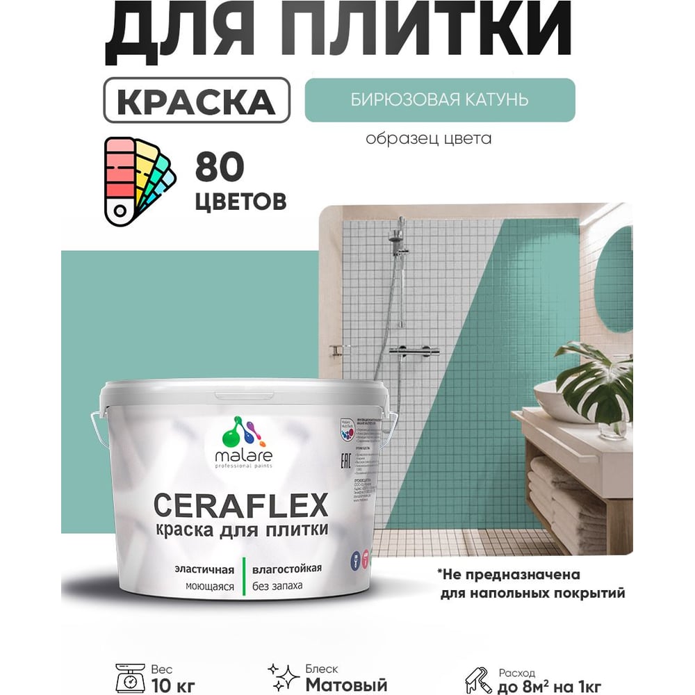 Краска акриловая MALARE Ceraflex для плитки, бирюзовая катунь, матовый, 10 кг ККРФЛКСАБИКМ1000