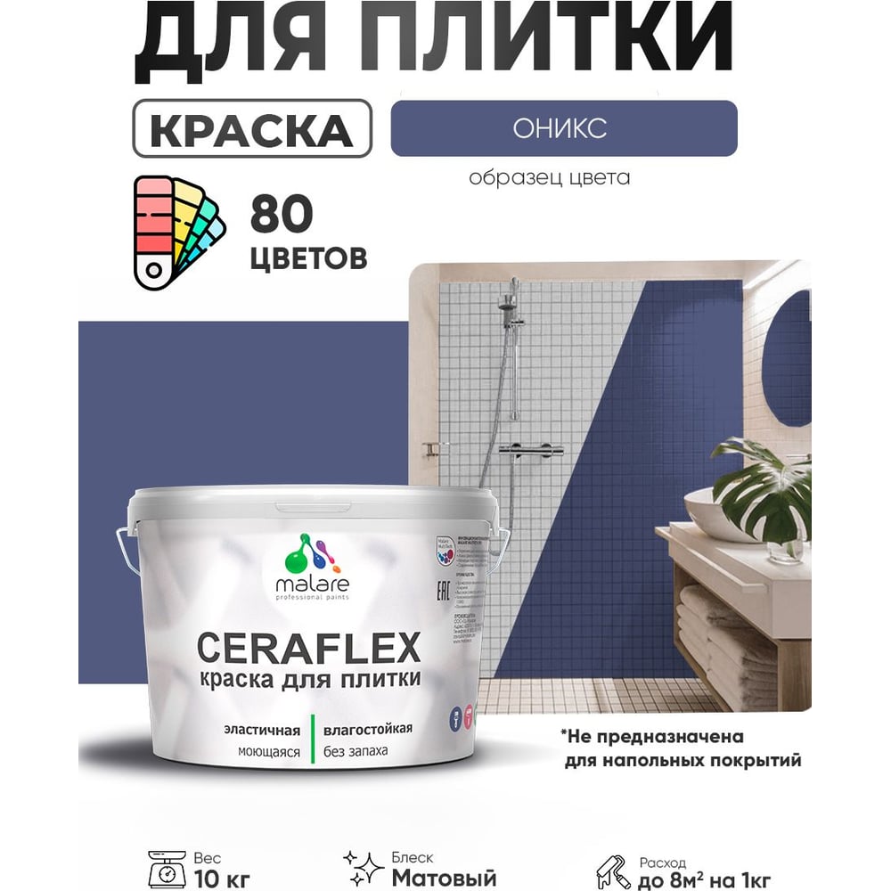 Краска акриловая MALARE Ceraflex для плитки, оникс, матовый, 10 кг ККРФЛКСАОНИМ1000