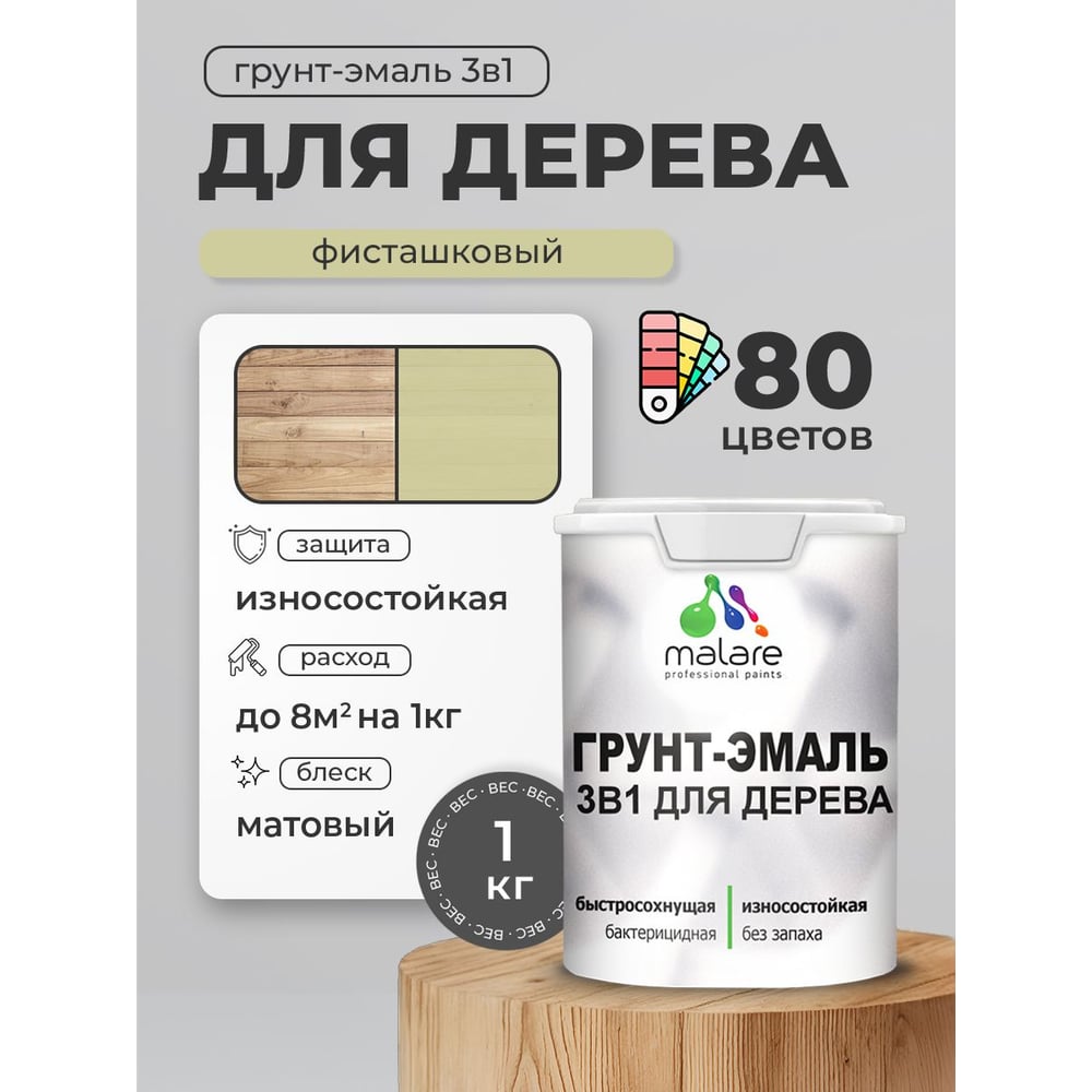 Грунт-Эмаль MALARE 3 в 1 для деревянных поверхностей, акриловая, моющаяся, без запаха, матовая, фисташковый, 1 кг ГЭДЕРАФИСМ0100