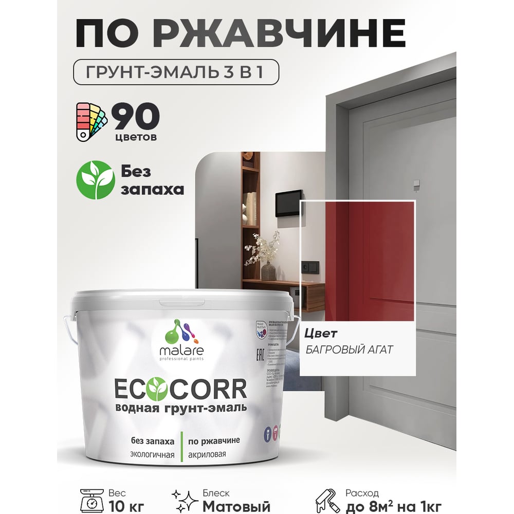 Грунт-Эмаль 3в1 MALARE EcoCorr для металлических поверхностей, акриловая быстросохнущая без запаха, матовая, багровый агат, 10 кг ГЭЭКОБААМ1000