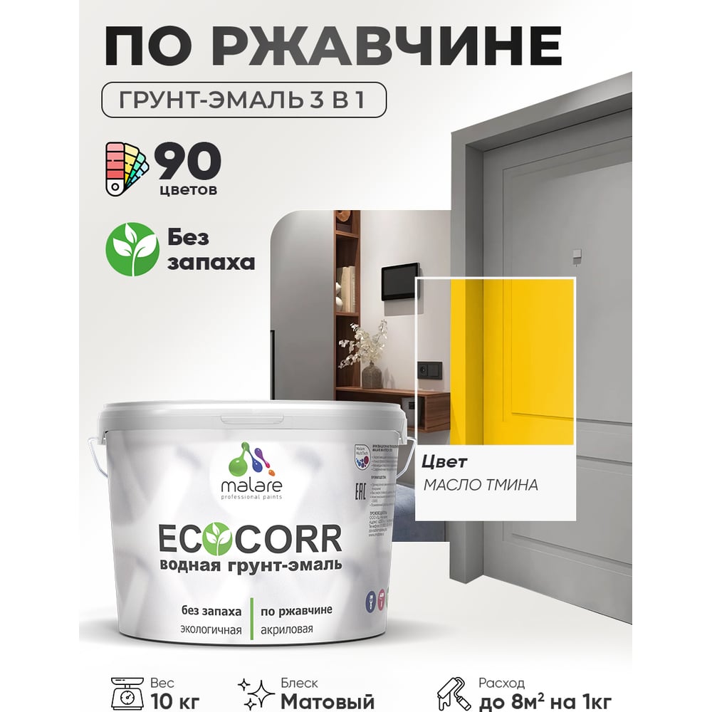Грунт-Эмаль 3в1 MALARE EcoCorr для металлических поверхностей, акриловая быстросохнущая без запаха, матовая, масло тмина, 10 кг ГЭЭКОМАТМ1000