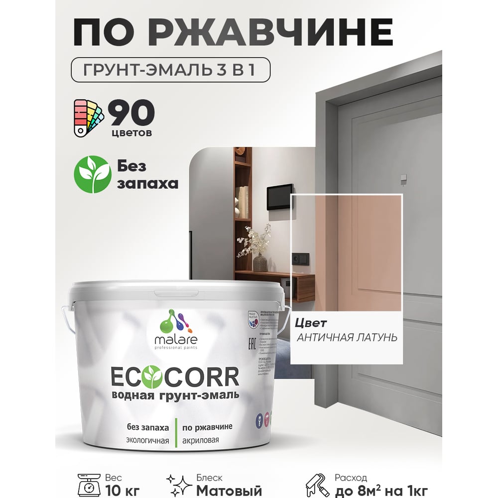 Грунт-Эмаль 3в1 MALARE EcoCorr для металлических поверхностей, акриловая быстросохнущая без запаха, матовая, античная латунь, 10 кг ГЭЭКОАНЛМ1000