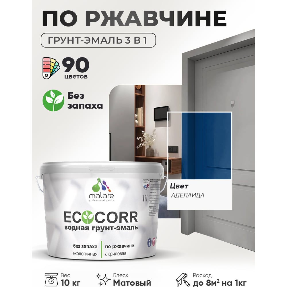 Грунт-Эмаль 3в1 MALARE EcoCorr для металлических поверхностей, акриловая быстросохнущая без запаха, матовая, аделаида, 10 кг ГЭЭКОАДЕМ1000