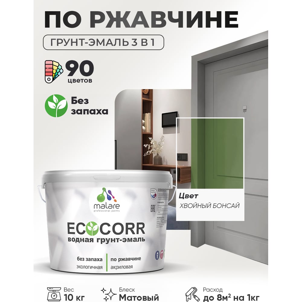 Грунт-Эмаль 3в1 MALARE EcoCorr для металлических поверхностей, акриловая быстросохнущая без запаха, матовая, хвойный бонсай, 10 кг ГЭЭКОХВБМ1000