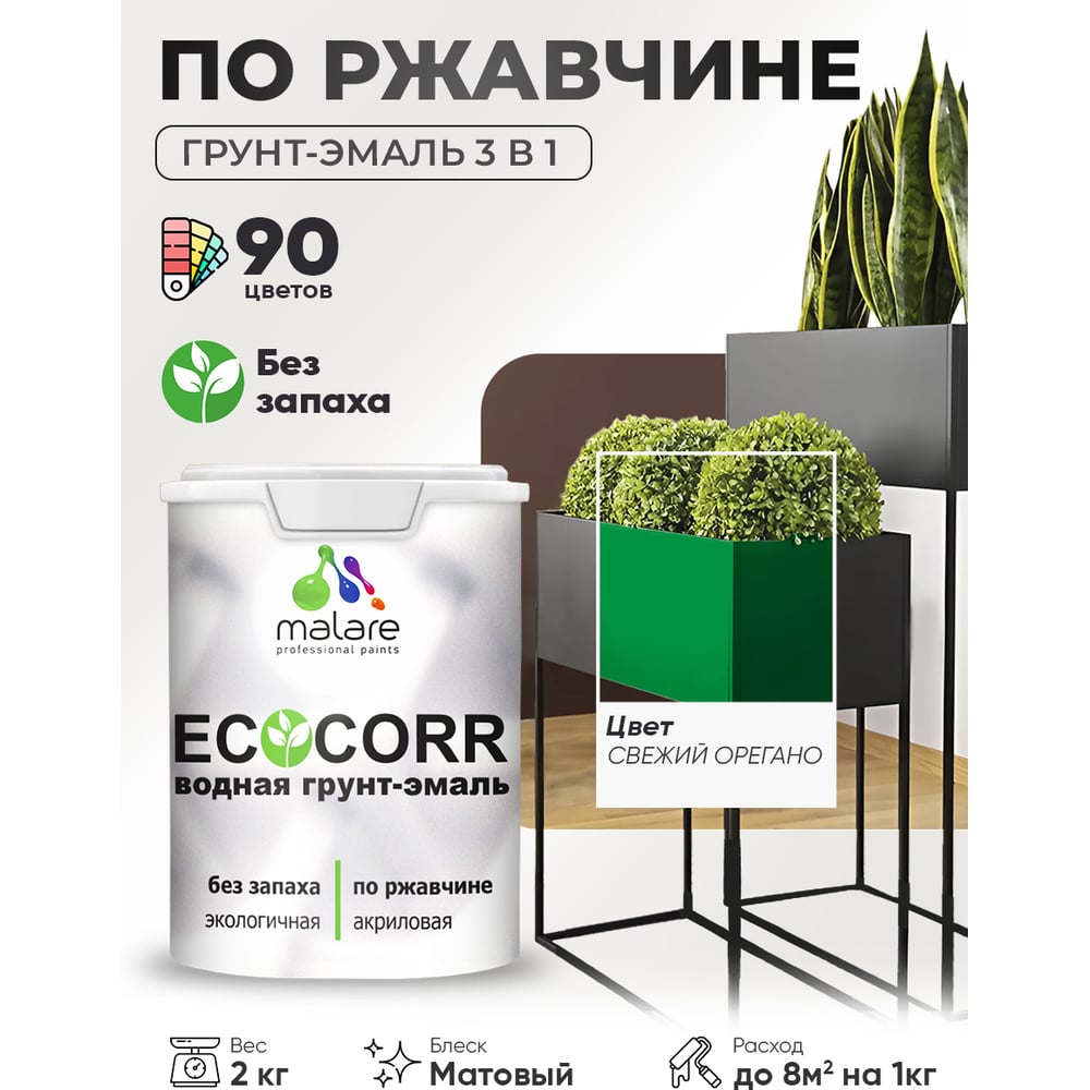 Грунт-Эмаль 3в1 MALARE EcoCorr для металлических поверхностей, акриловая быстросохнущая без запаха, матовая, свежий орегано, 2 кг ГЭЭКОСВОМ0200
