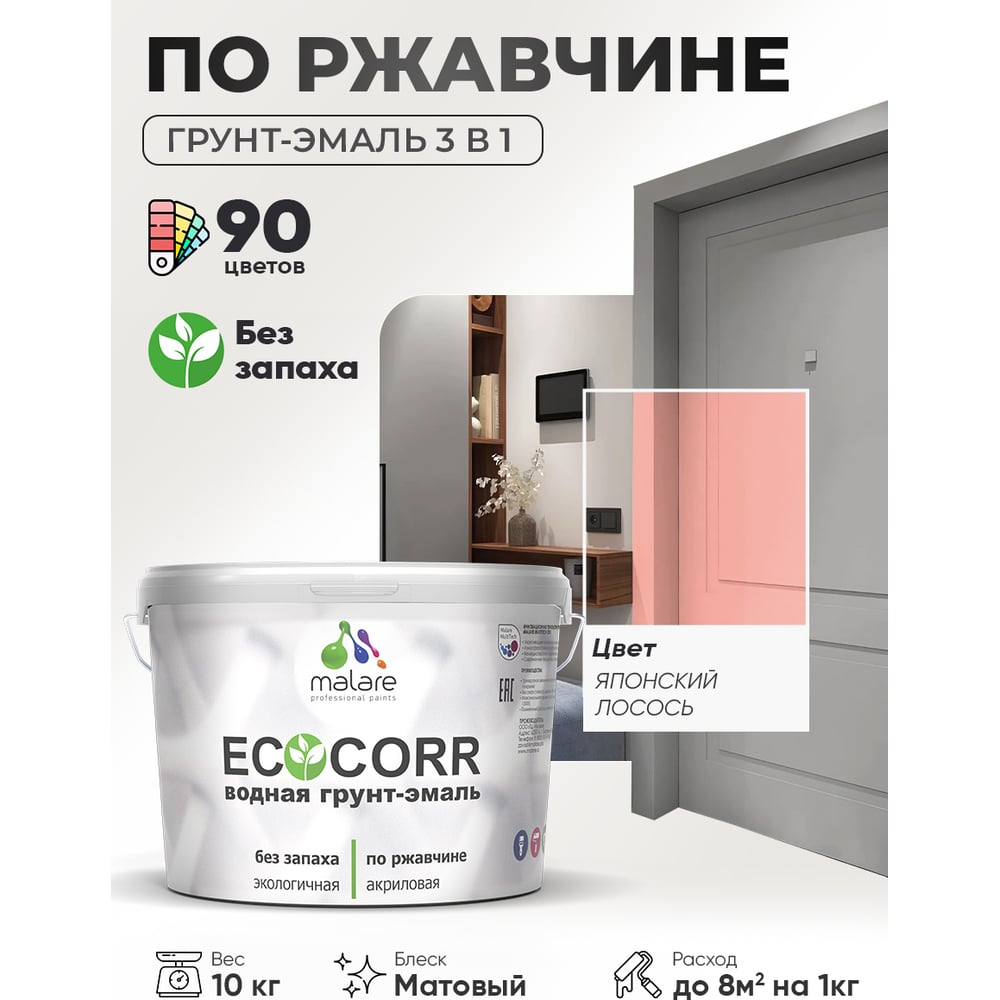 Грунт-Эмаль 3в1 MALARE EcoCorr для металлических поверхностей, акриловая быстросохнущая без запаха, матовая, японский лосось, 10 кг ГЭЭКОЯПЛМ1000