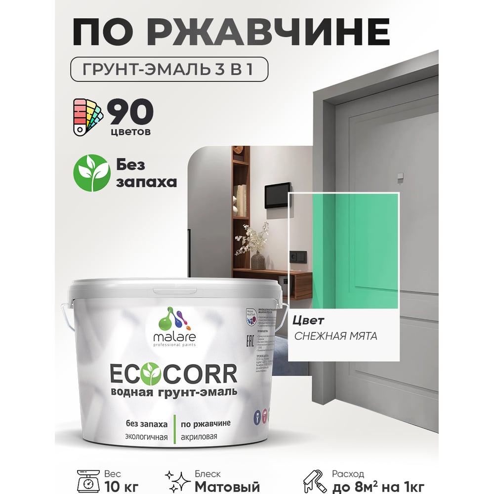 Грунт-Эмаль 3в1 MALARE EcoCorr для металлических поверхностей, акриловая быстросохнущая без запаха, матовая, снежная мята, 10 кг ГЭЭКОСНММ1000