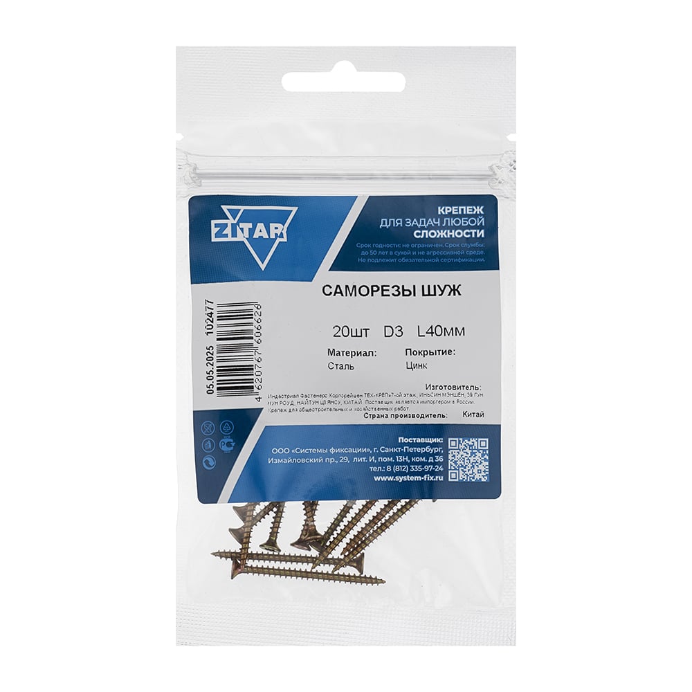Саморез ШУж с потайной головкой 3,0x40 мм, 20 шт., пакет Zitar 102477