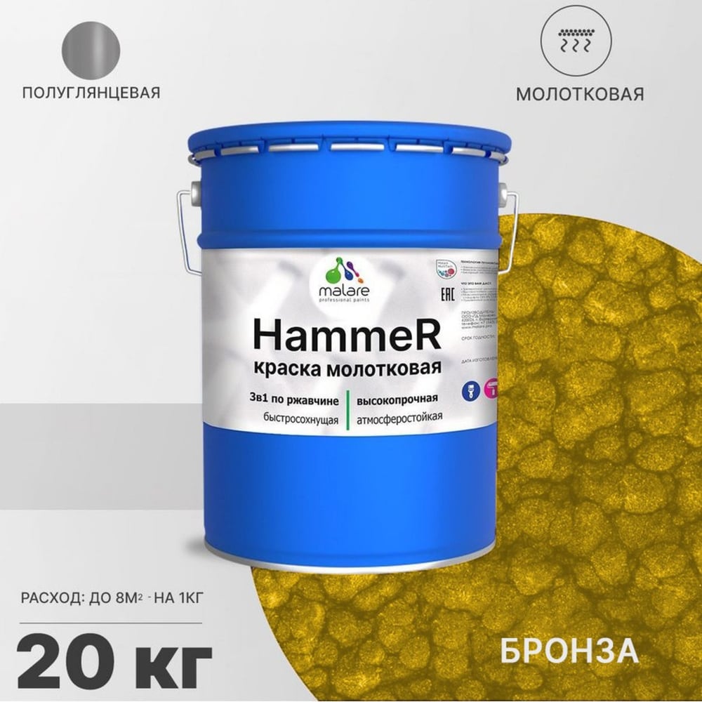 Грунт-Эмаль 3 в 1 MALARE Hammer для металлических поверхностей, молотковая краска, полуглянцевая, бронза, 20 кг КХАМБРОГ2000
