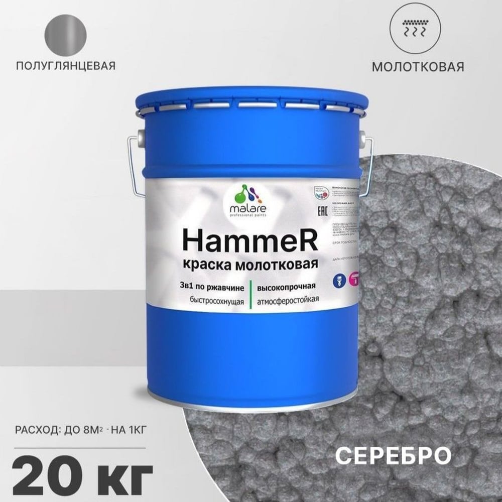 Грунт-Эмаль 3 в 1 MALARE Hammer для металлических поверхностей, молотковая краска, полуглянцевая, серебристый, 20 кг КХАМСЕРГ2000