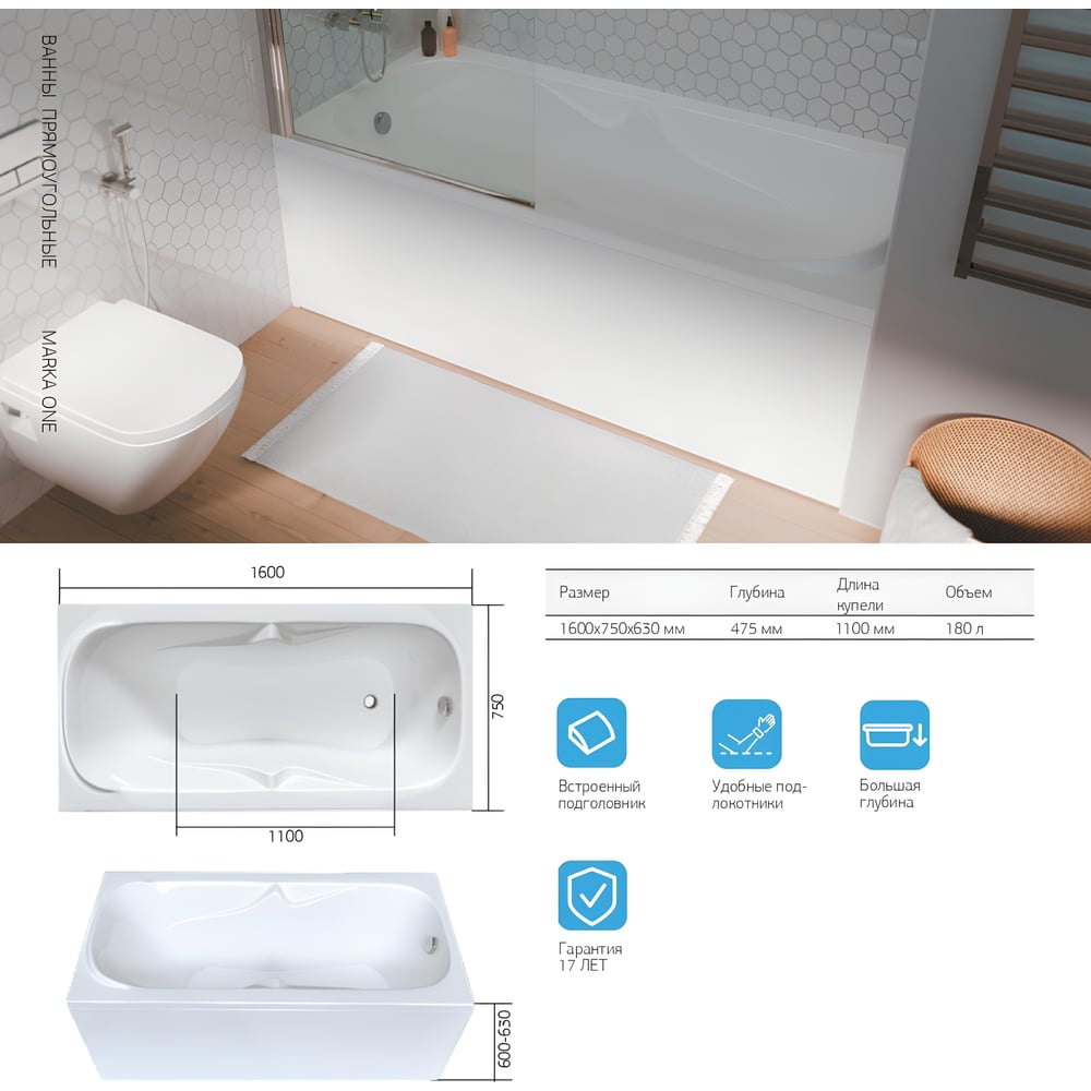 | Глубина ванны | 475 мм |