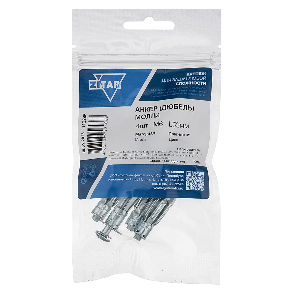 Анкер-дюбель Молли М6x52 мм, 4 шт в пакете Zitar 112286