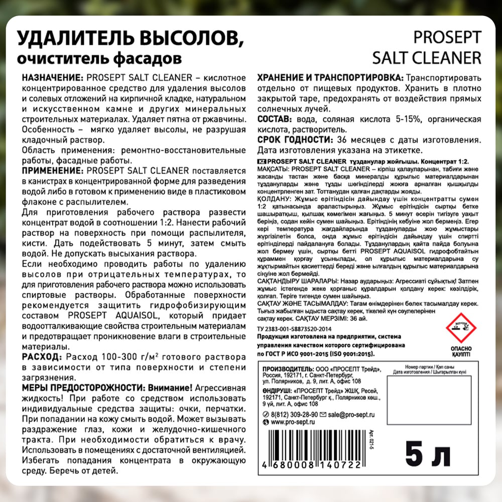 Удалитель высолов с минеральных поверхностей PROSEPT SALT CLEANER, 5л, концентрат 1:2, 021-5
