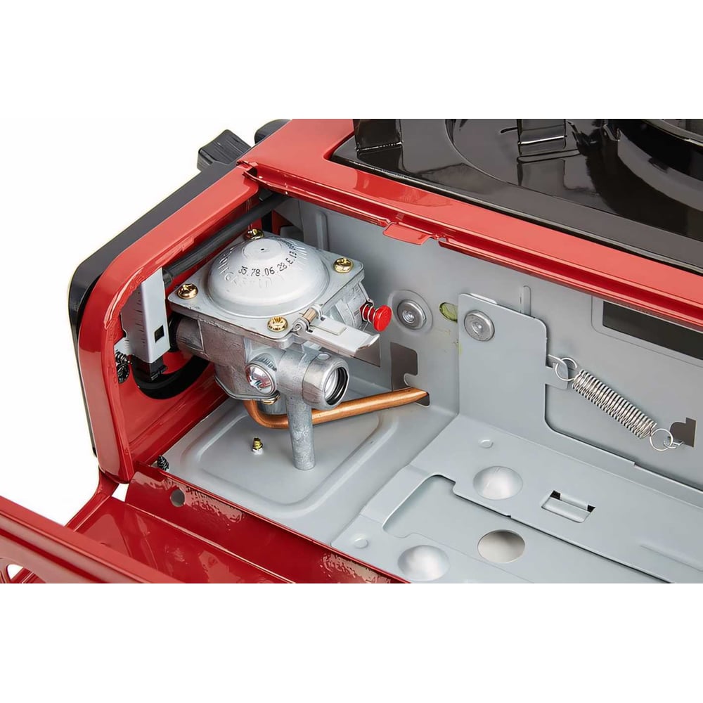 Габариты без упаковки 113х340х280 мм Цвет красный Вес нетто 1.4 кг Назначение для приготовления пищи Мощность 2200 Вт Питание газ Пьезоподжиг да Количество конфорок 1 шт Соединение баллона цанговое