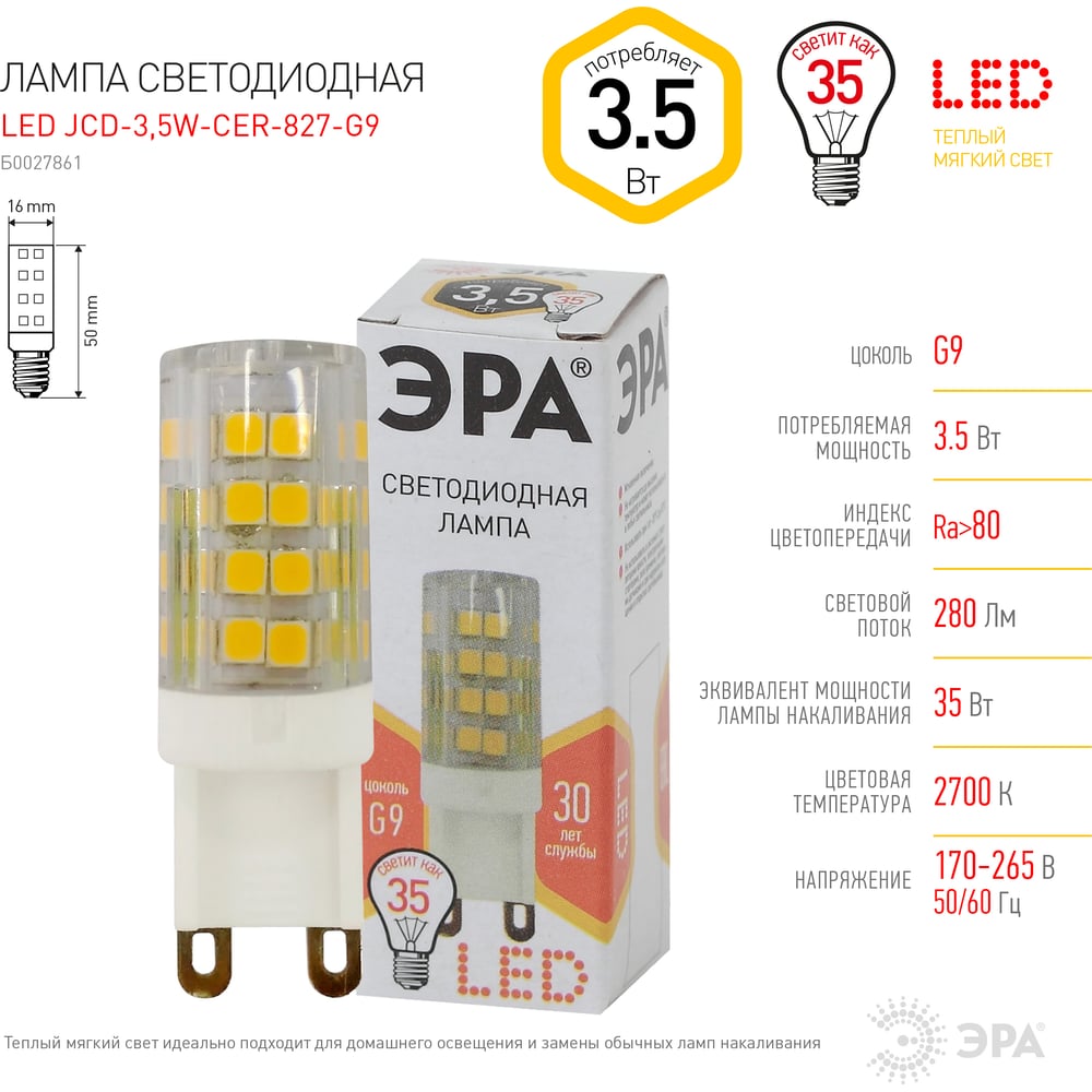 Светодиодная лампа ЭРА LED smd JCD-3,5w-220V-corn, ceramics-827-G9 Б0027861