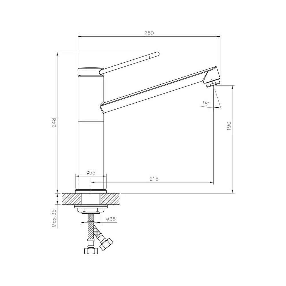 Покрытие глянцевое Цвет хром Тип установки настольный/на раковину Вес нетто 1.7 кг Стиль современный Материал корпуса латунь Поворотный излив да Назначение для кухни Тип крепления на гайку Гибкий излив нет Длина излива 215 мм Высота смесителя 248 мм Лейка нет Термостат нет Встраиваемый нет Подводка в комплекте гибкая Аэратор да Переключатель на фильтр нет Тип смесителя однорычажный Форма излива воды традиционная Запорный клапан керамический картридж Форма смесителя плоская Выдвижной излив нет Излив есть Складной нет С щеткой нет Двойной излив нет Диаметр картриджа 35 мм Направление струи под углом Диаметр отверстия в раковине 35 мм Высота излива 190 мм Мах толщина столешницы 35 мм Расположение термостата без термостата