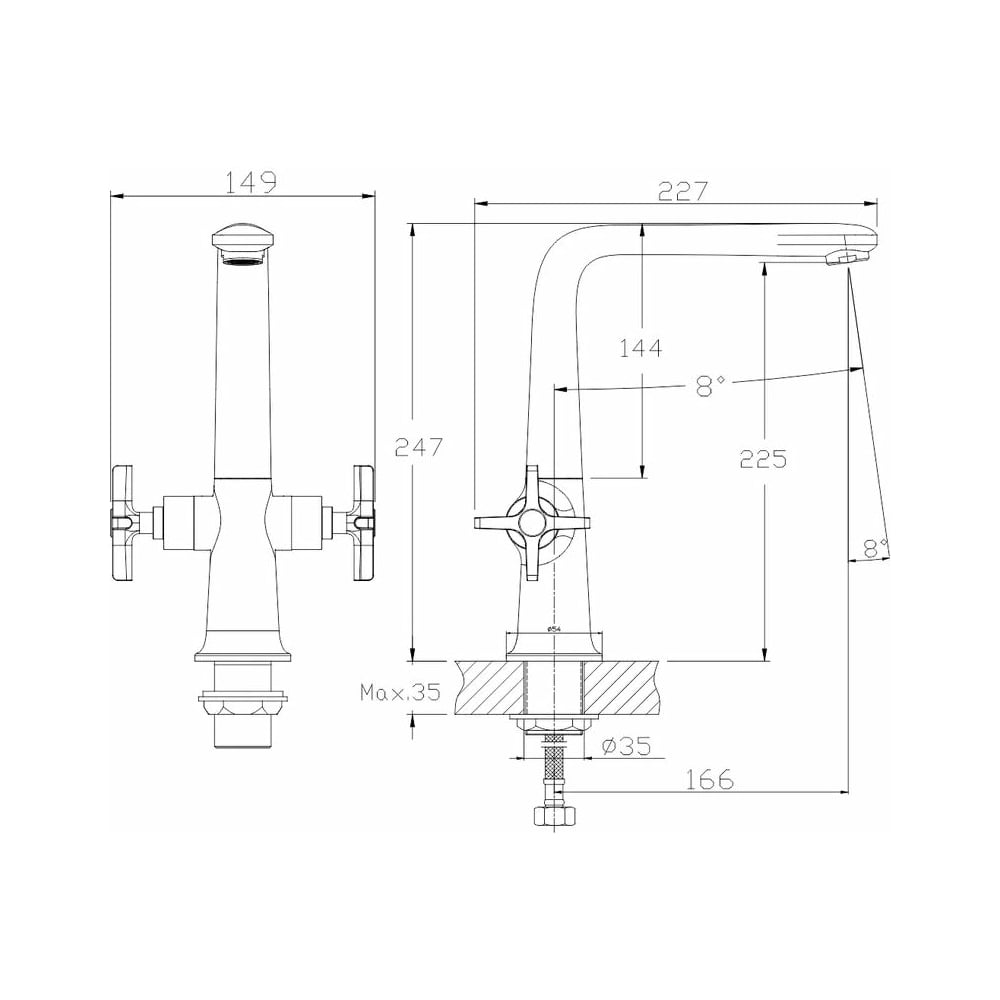 Цвет хром Тип установки настольный/на раковину Вес нетто 1.81 кг Стиль современный Материал корпуса латунь Серия Oxford Поворотный излив да Назначение для кухни Тип крепления на гайку Гибкий излив нет Длина излива 166 мм Высота смесителя 247 мм Лейка нет Термостат нет Встраиваемый нет Подводка в комплекте гибкая Аэратор нет Переключатель на фильтр нет Тип смесителя двухрычажный Форма излива воды традиционная Запорный клапан керамическая кран-букса Форма смесителя плоская Выдвижной излив нет Излив есть Складной нет С щеткой нет Двойной излив нет Направление струи под углом Диаметр отверстия в раковине 35 мм Форма маховиков крестик Высота излива 166 мм Расположение термостата без термостата