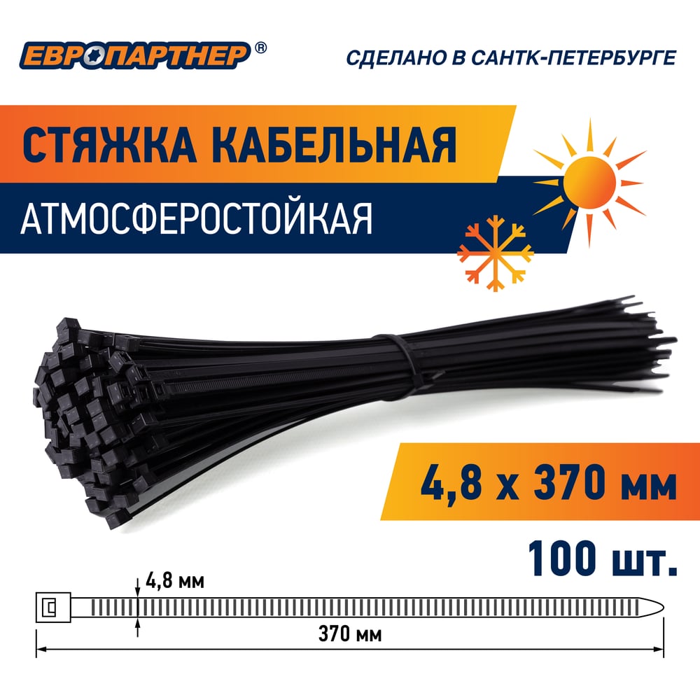 Кабельная нейлоновая стяжка ЕВРОПАРТНЕР PRNS 370x4.8 черная атмосферостойкая, 100 шт. 76062560