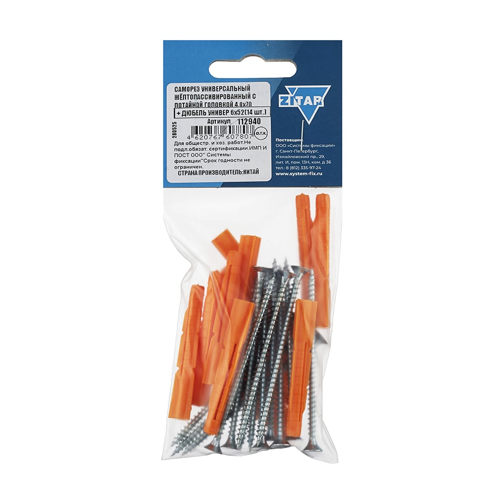 Саморез ШУж с потайной головкой 4,0x70 мм + универсальный дюбель 6x52 мм, 14 шт в пакете Zitar 112940