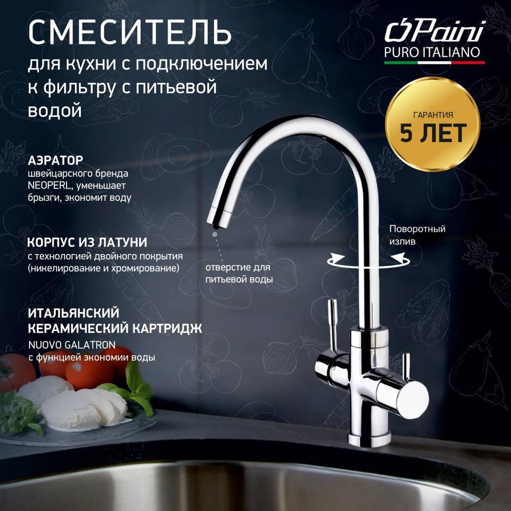 Смеситель для кухни Paini Cox с подключением к фильтру питьевой воды, хром 17725
