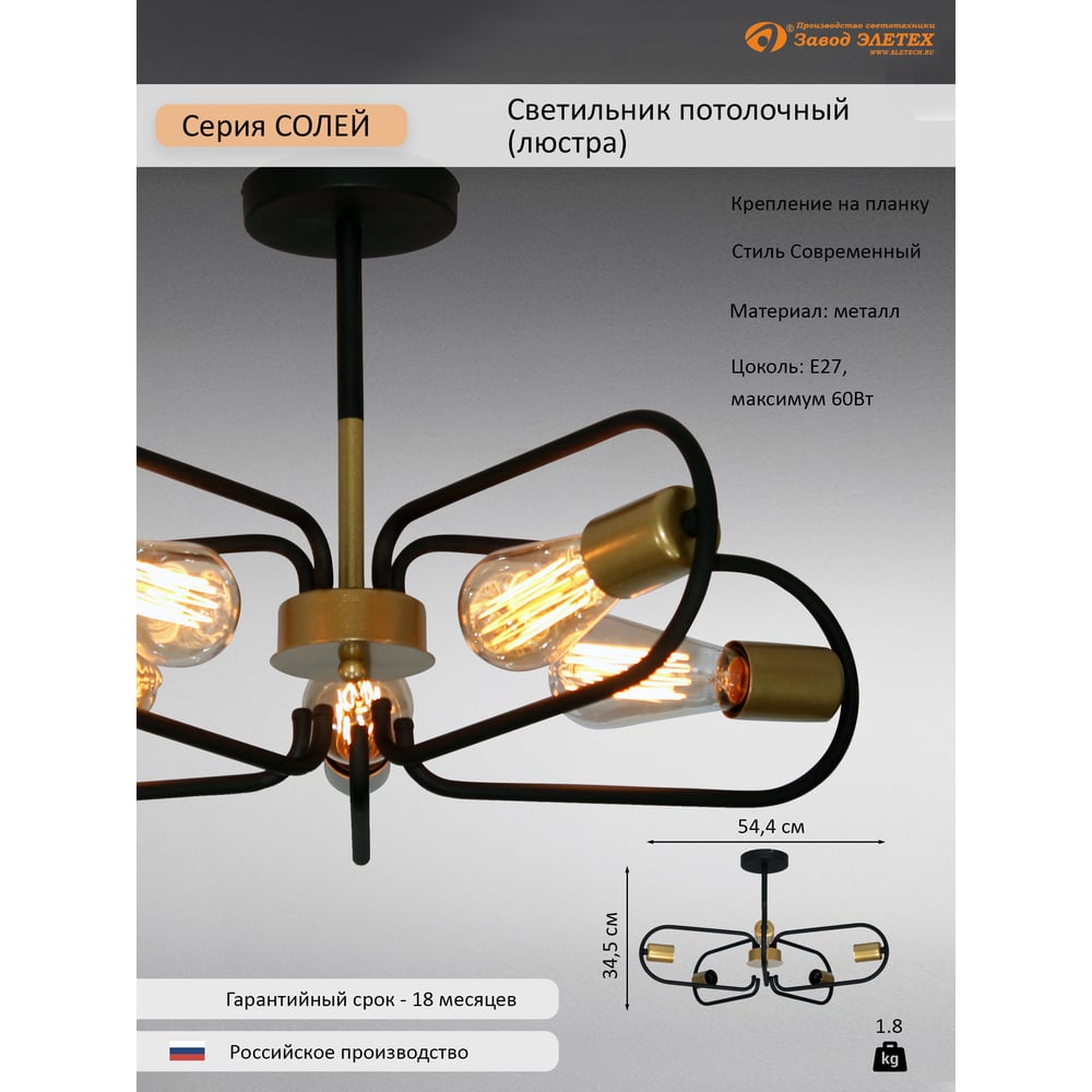 Светильник потолочный ЭЛЕТЕХ Солей 151 черн.зол. НПБ 01-5x60-166 Е27 1005405393