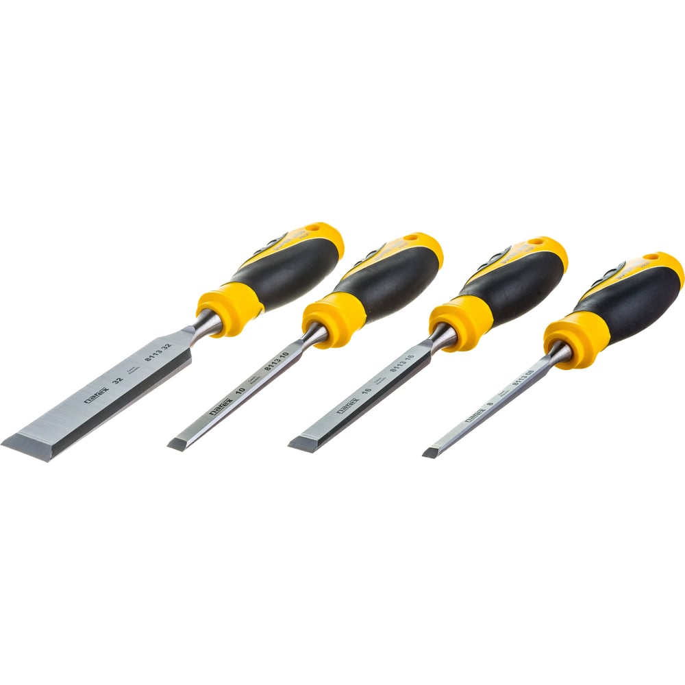 Длина 245 мм Вес нетто 0.872 кг Материал рукояти двухкомпонентный Тип упаковки коробка Материал лезвия CrMn Ширина режущей части 8/10/16/32 мм В наборе 4 шт