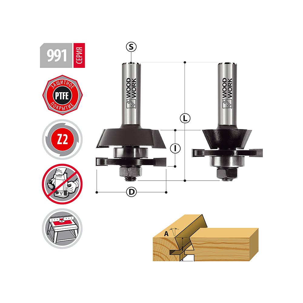 Комплект фрез для мебельной обвязки A=22.5 мм, D=44.4 мм, I=23.8 мм, L=76 мм, S=12 мм, Z=2 WOODWORK 991.2302.12