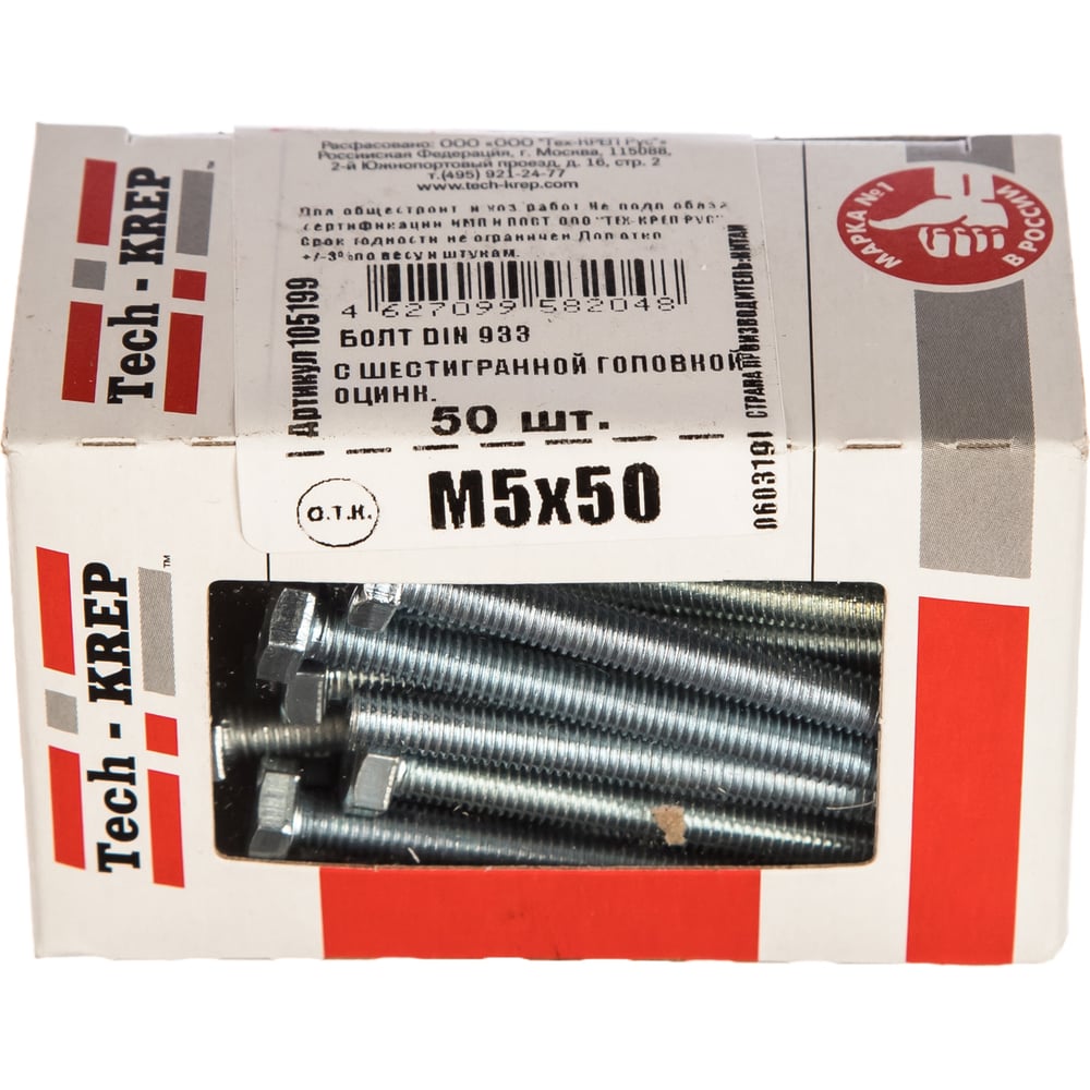 Болт DIN 933 с шестигранной головкой, оцинкованный М5х50, 50шт - коробка Tech-Krep 105199