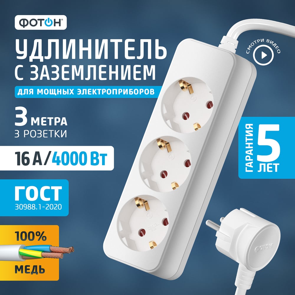 Сетевой удлинитель 1х3, 3м, 16А, с заземлением, белый ФОТОН 16-33Е 11848