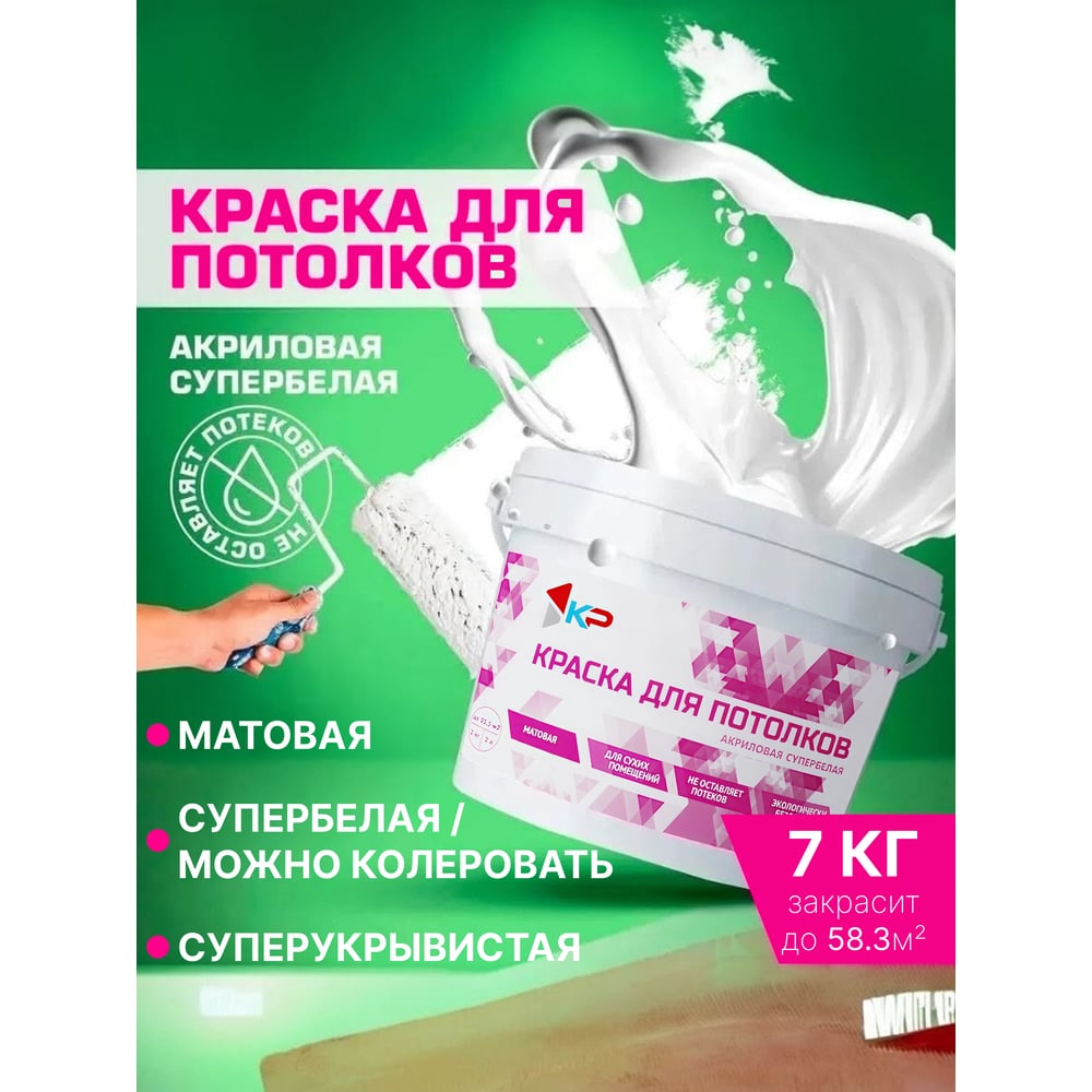 Краска супербелая для потолков быстросохнущая, акриловая, матовое покрытие КР 7 кг 4300009161