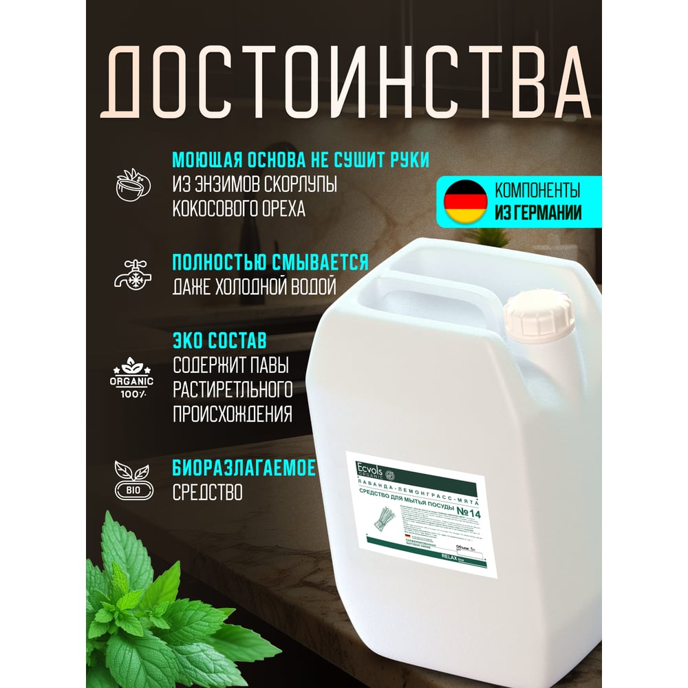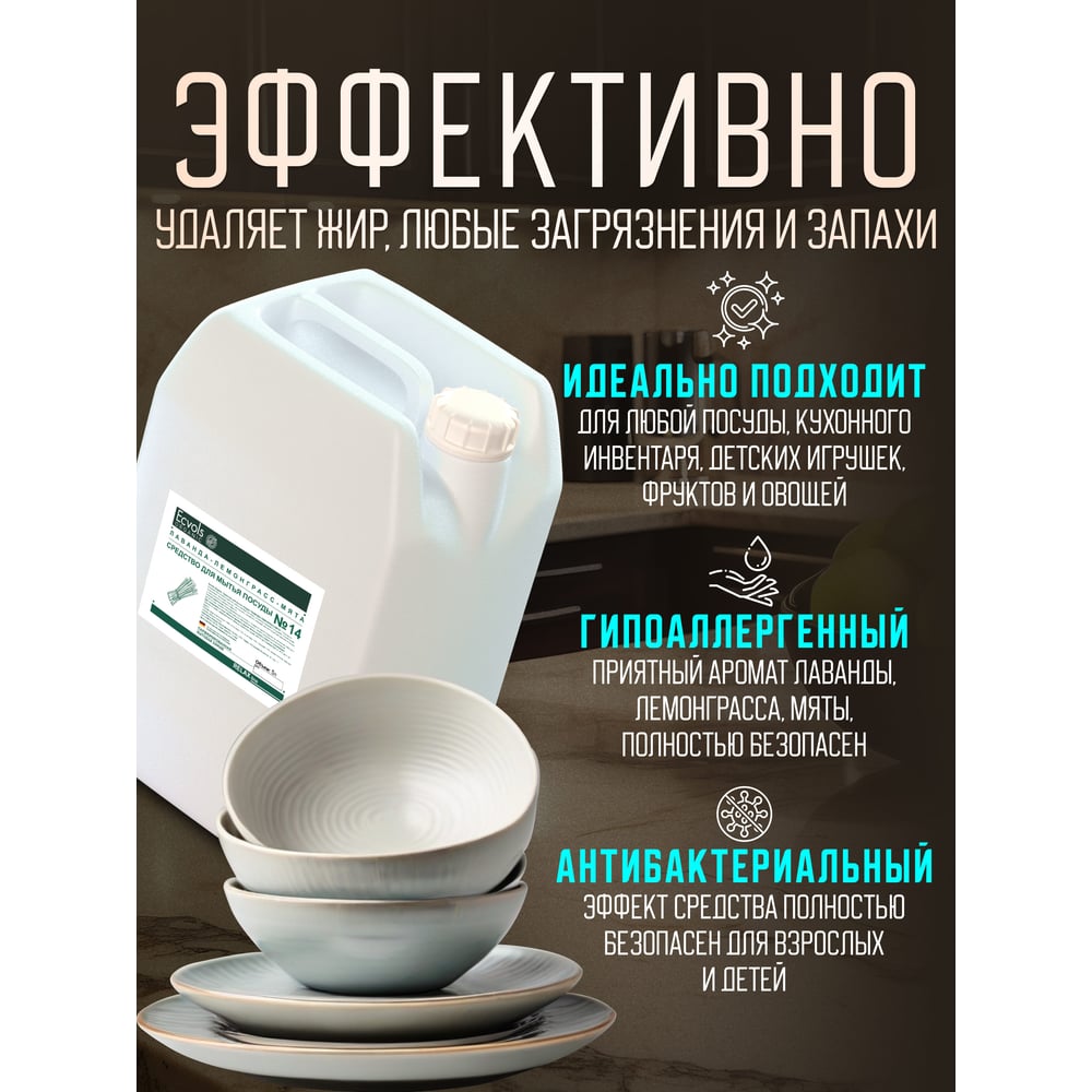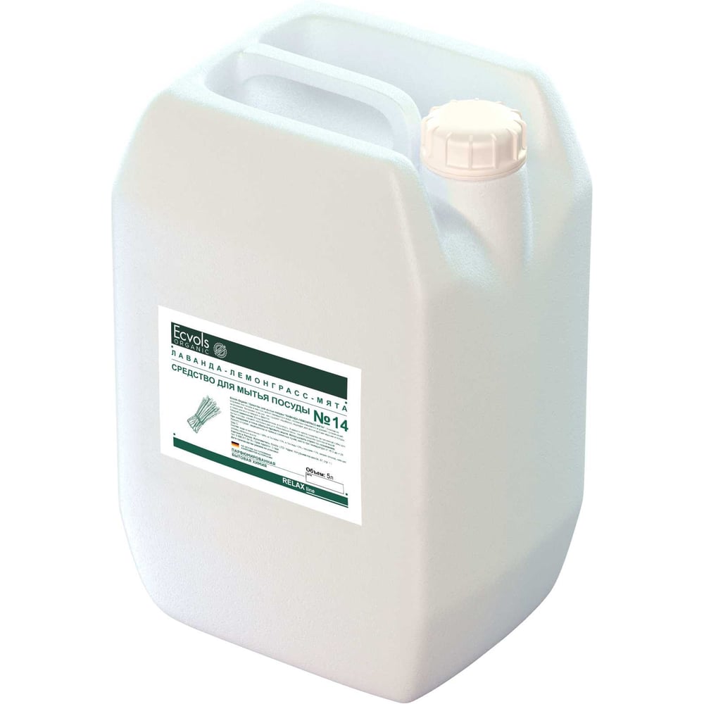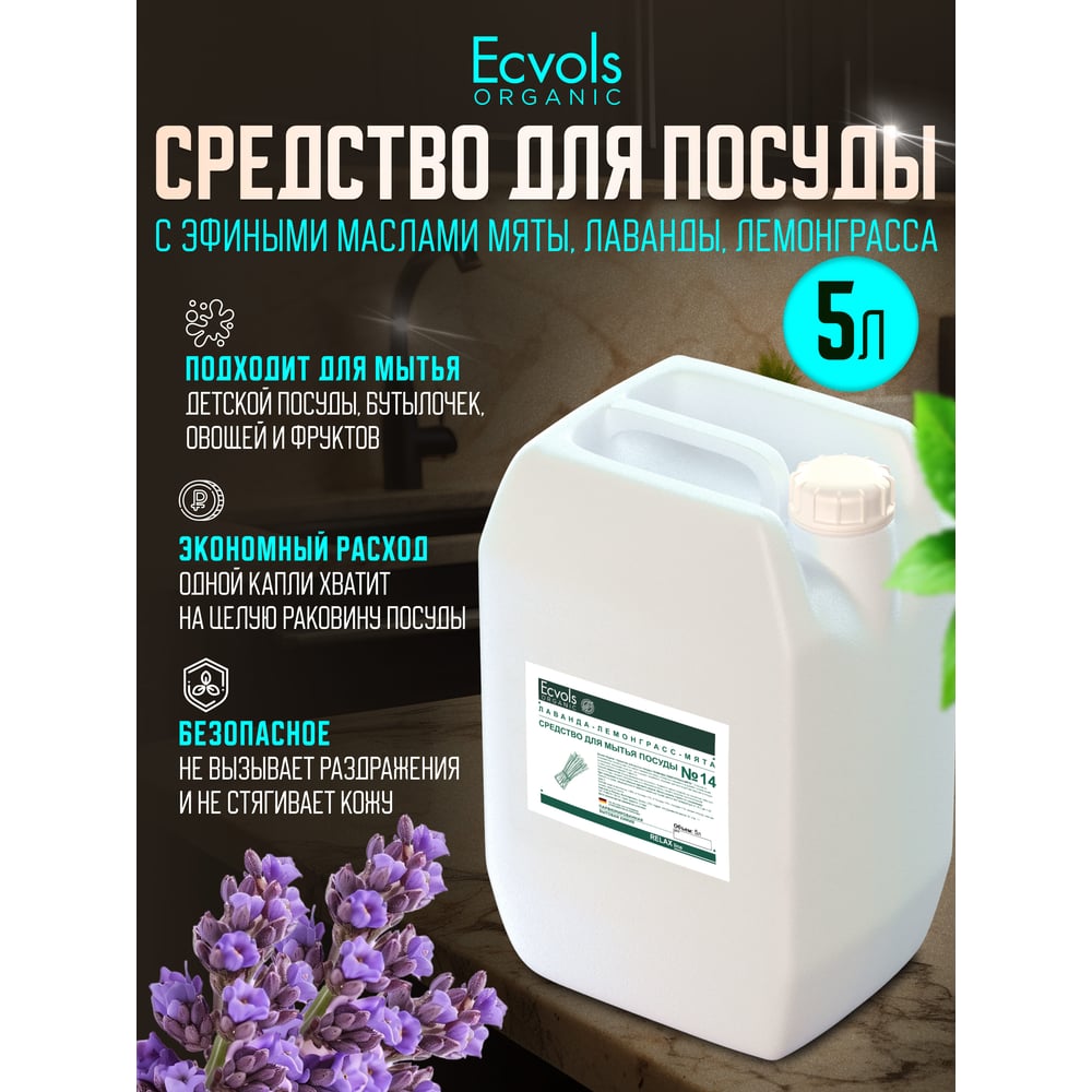 Средство для мытья посуды Ecvols №21 с эфирными маслами Лаванда Мята, гипоаллергенное, канистра 5 л 00.21di5000