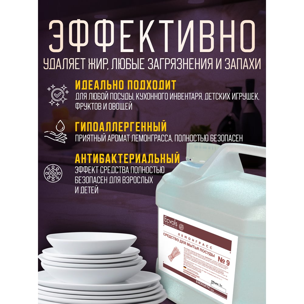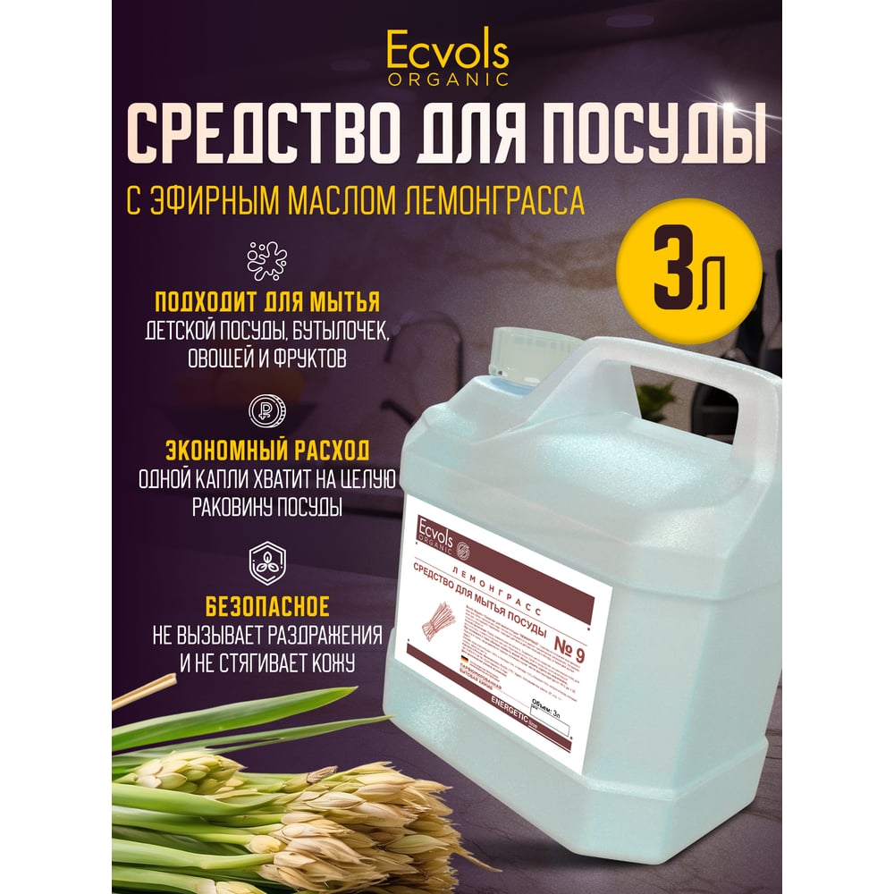 Средство для мытья посуды Ecvols №9 с эфирным маслом Лемонграсса, гипоаллергенное, канистра 3 л 00.09di3000