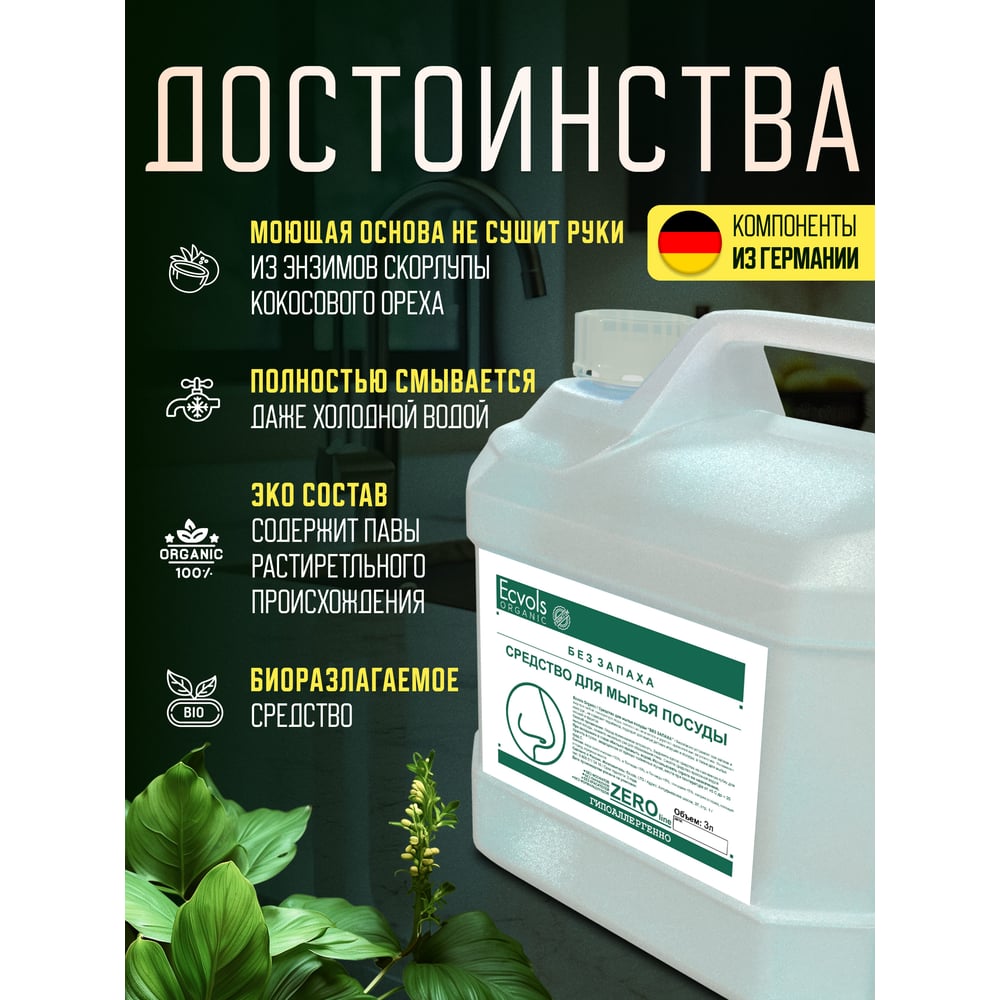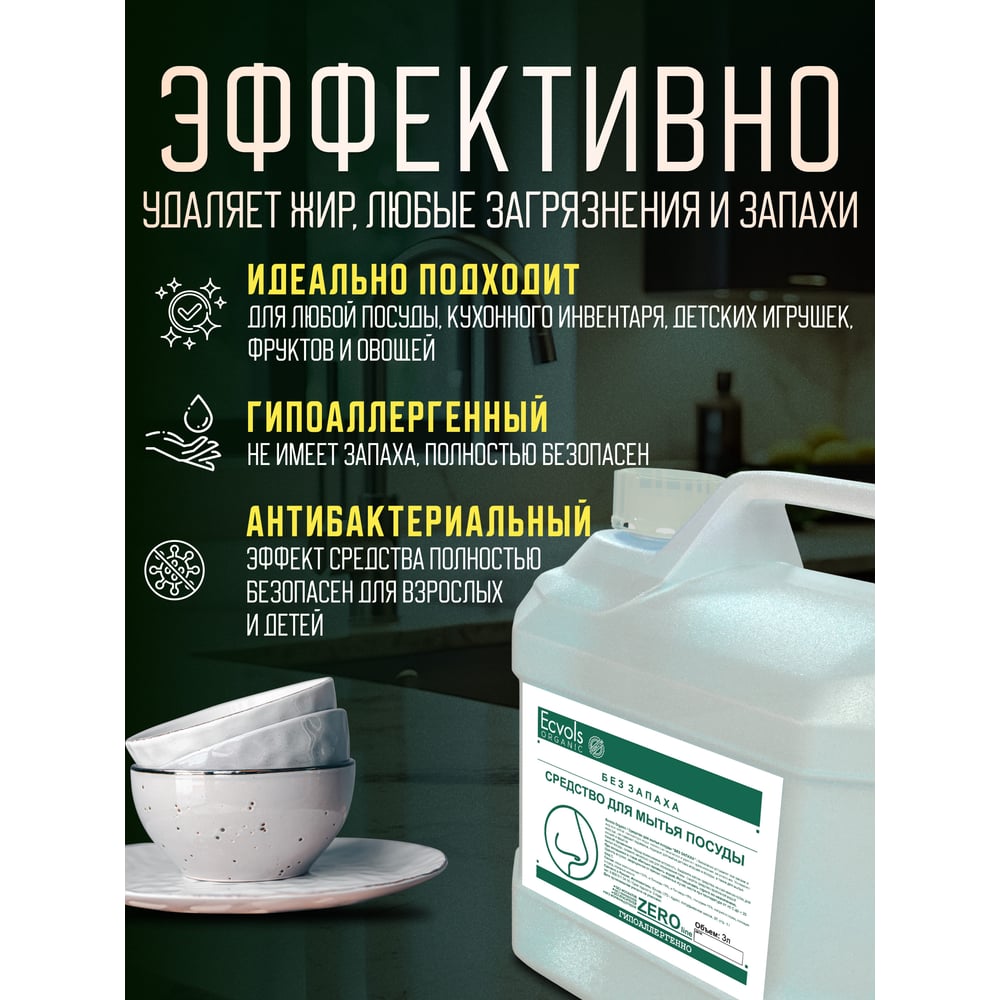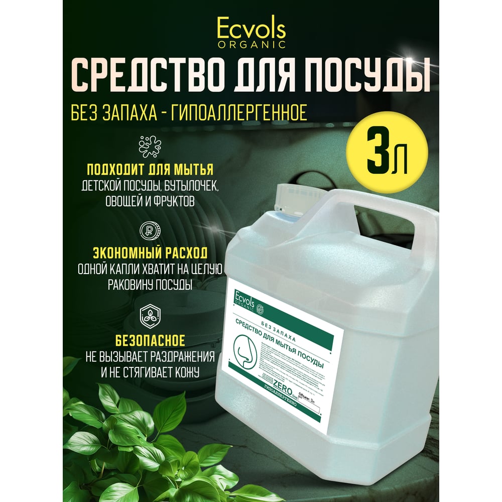 Средство для мытья посуды Ecvols ZERO без запаха, без отдушки, гипоаллергенное, канистра 3 л 00.00di3000