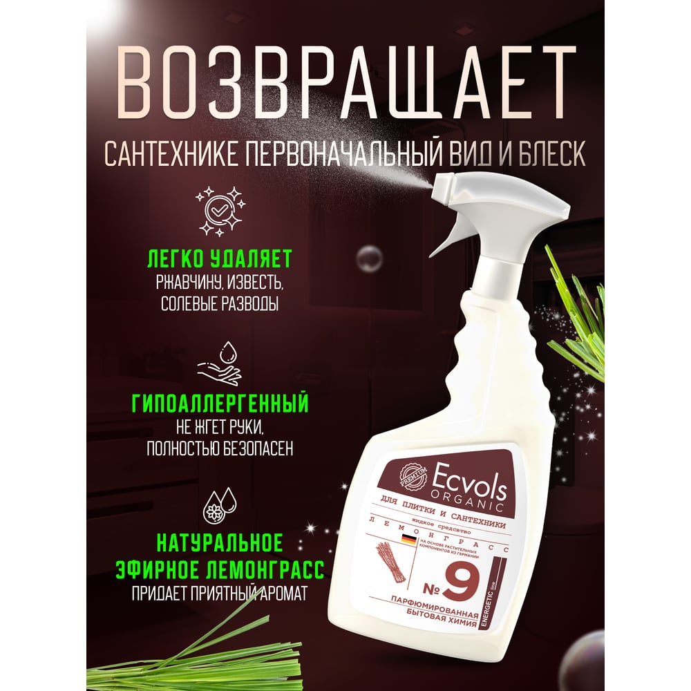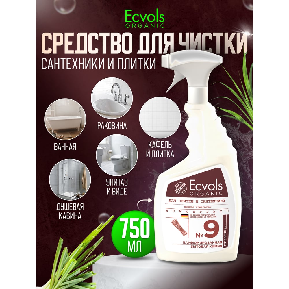 Средство для чистки сантехники, ванной, душевой кабины, плитки Ecvols №9 с эфирными маслами Лемонграсса, 750 мл 00.09pl750