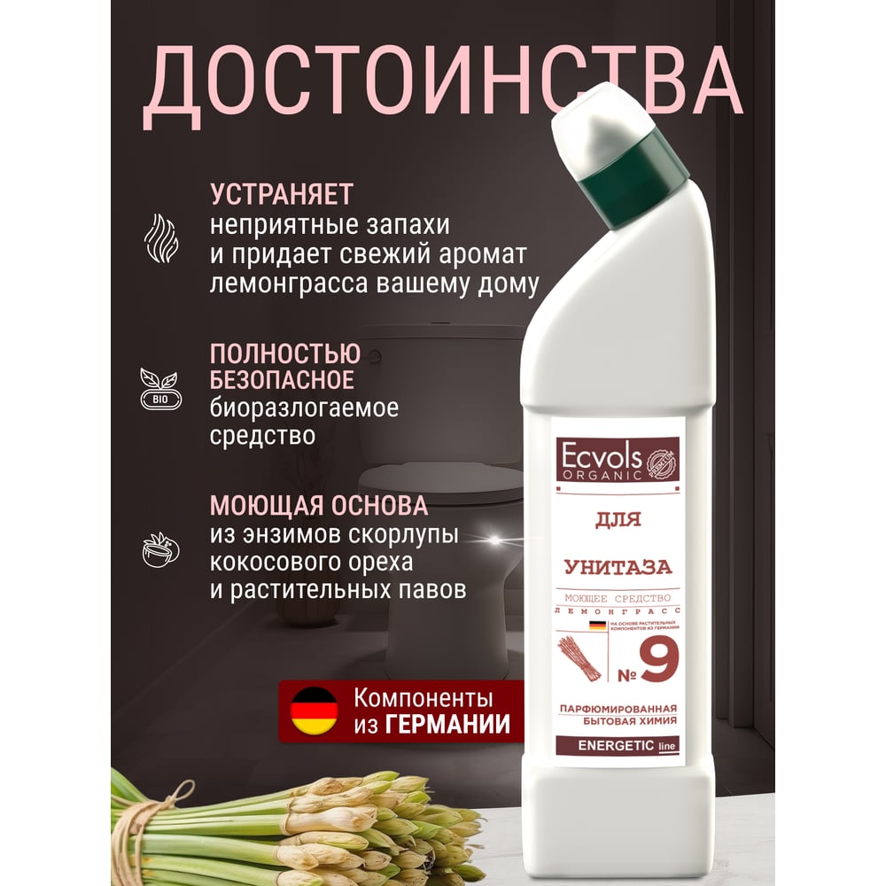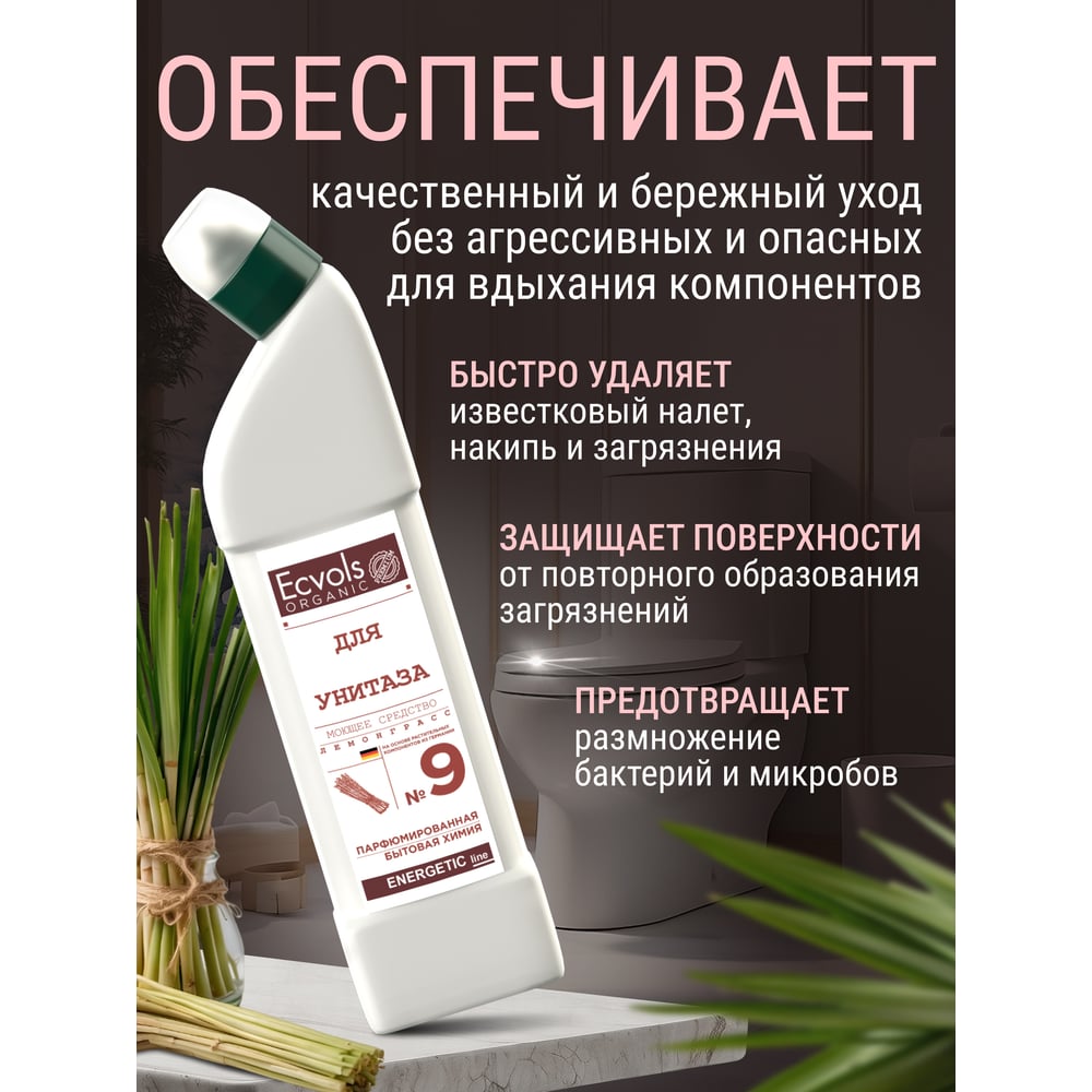 Органическое средство для чистки унитаза Ecvols №9, без хлорки с эфирным маслом Лемонграсс, 750 мл 00.09to750