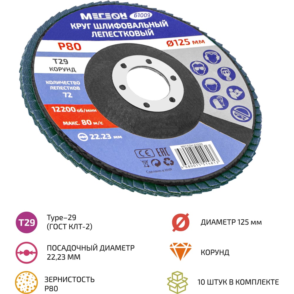 Круг шлифовальный лепестковый 125 мм, P80, 10 шт 61009-10 МЕГЕОН к0000396370