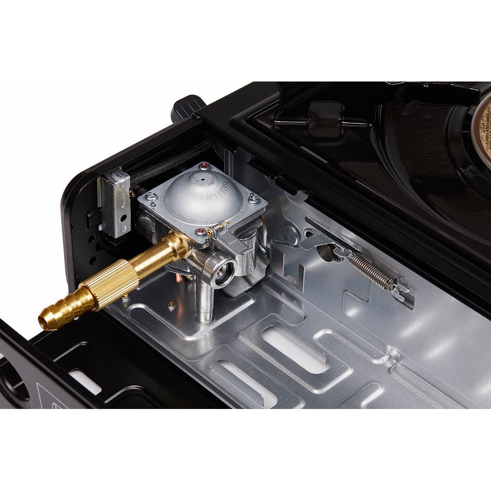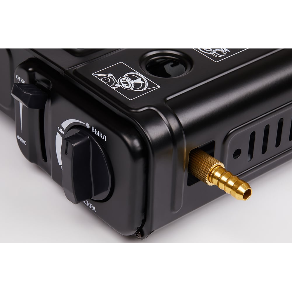 Габариты без упаковки 343х284х113 мм Цвет черный Вес нетто 2.31 кг Назначение для приготовления пищи Мощность 1800 Вт Питание газ Пьезоподжиг да Количество конфорок 1 шт Соединение баллона цанговое