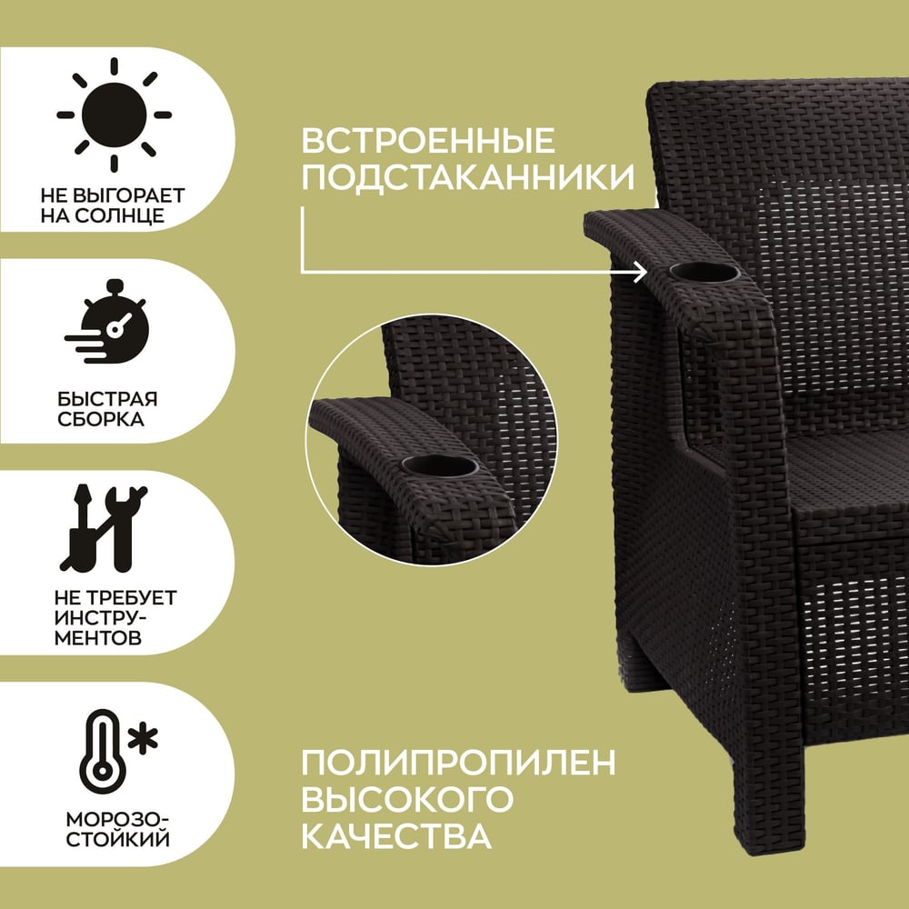 Комплект садовой мебели WORKY кофейный на 2 персоны (2 кресла + кофейный столик), искусственный ротанг, мокко, без подушек ARD258133