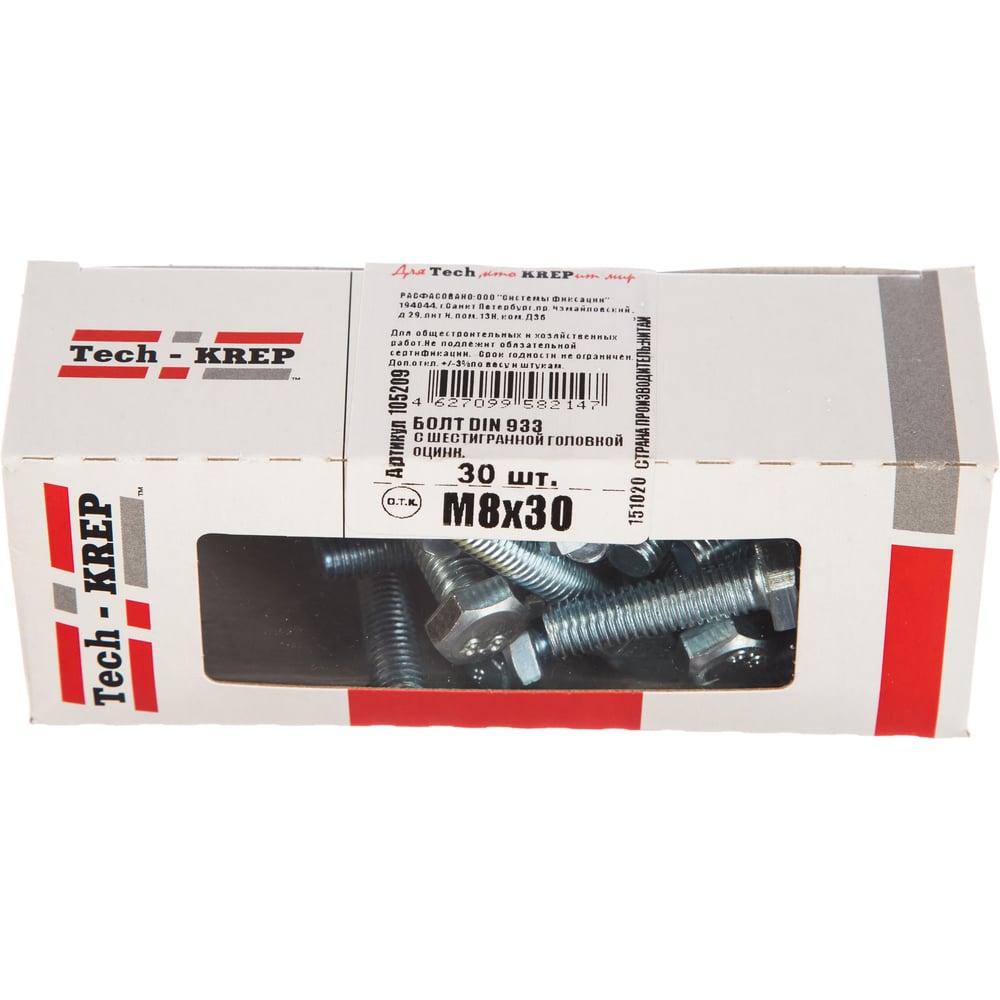 Болт DIN 933 с шестигранной головкой, оцинкованный М8х30, 30шт - коробка Tech-Krep 105209