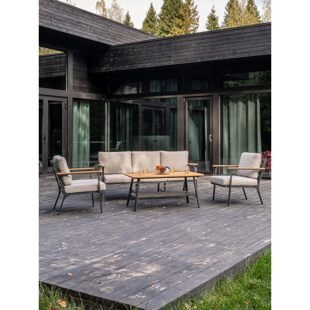 Габариты без упаковки 1750х800х630 мм Покрытие порошковая краска Вес нетто 54 кг Материал корпуса алюминий Цвет корпуса коричневый/черный Назначение для дачи и сада Количество предметов 4 Max нагрузка 150 кг Материал обивки нет Форма столешницы прямоугольник Материал столешницы закаленное стекло Складная конструкция нет Водонепроницаемость да Высота стола 540 мм Габариты в сложенном виде 175х80х63 см мм Мягкое сиденье да Цвет обивки серый Состав комплекта стол, диван, кресла