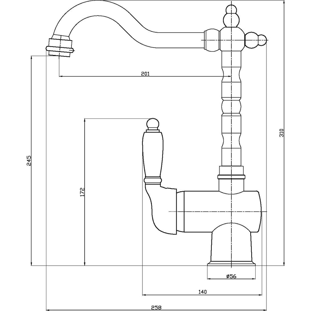 Покрытие глянцевое Цвет хром Тип установки настольный/на раковину Стиль ретро Материал корпуса латунь Серия VENEZIA Поворотный излив да Назначение для кухни Гибкий излив нет Длина излива 201 мм Высота смесителя 310 мм Лейка нет Термостат нет Встраиваемый нет Подводка в комплекте гибкая Аэратор да Переключатель на фильтр нет Тип смесителя однорычажный Форма излива воды традиционная Запорный клапан керамический картридж Форма смесителя округлая Выдвижной излив нет Излив есть Складной нет С щеткой нет Двойной излив нет Размер крепления G1/2 Направление струи вертикальное Расположение термостата без термостата