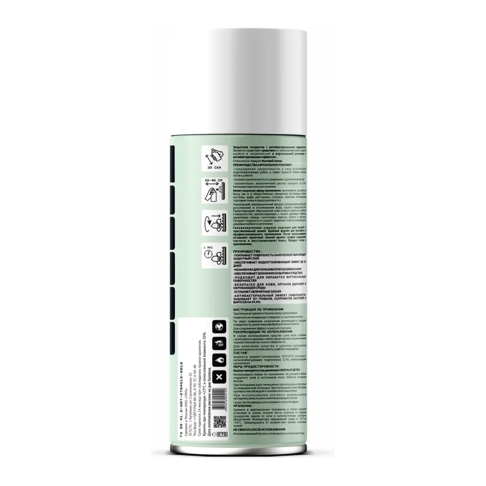 | Состав | жидкость водоотталкивающая, ПМГМГГХ(полигексаметиленбигуанидин гидрохлорид 0,5%), углеводородный пропеллент |