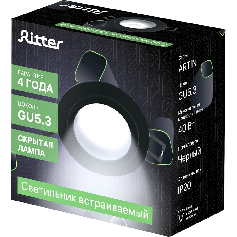 Встраиваемый потолочный светильник RITTER Artin круг скрытая лампа 92x92x40 монтажное отверстие 80x80 GU5.3 алюминий, черный 51416 9