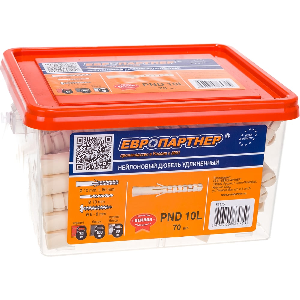 Удлиненный нейлоновый дюбель ЕВРОПАРТНЕР PND-10L 10х80 мм (70 шт.) 86475