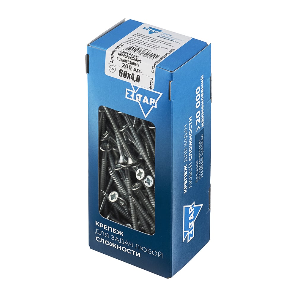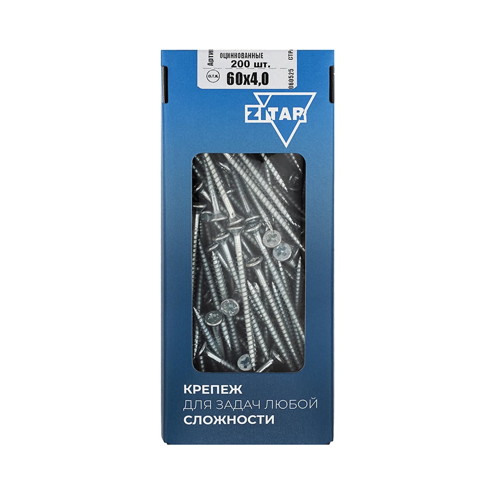 Универсальные саморезы, оцинкованные, 60x4,0 мм, 200 шт., коробка с окном Zitar 102185