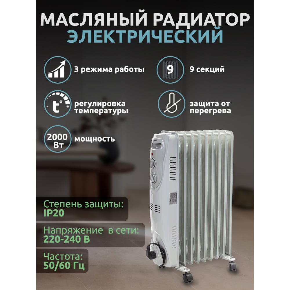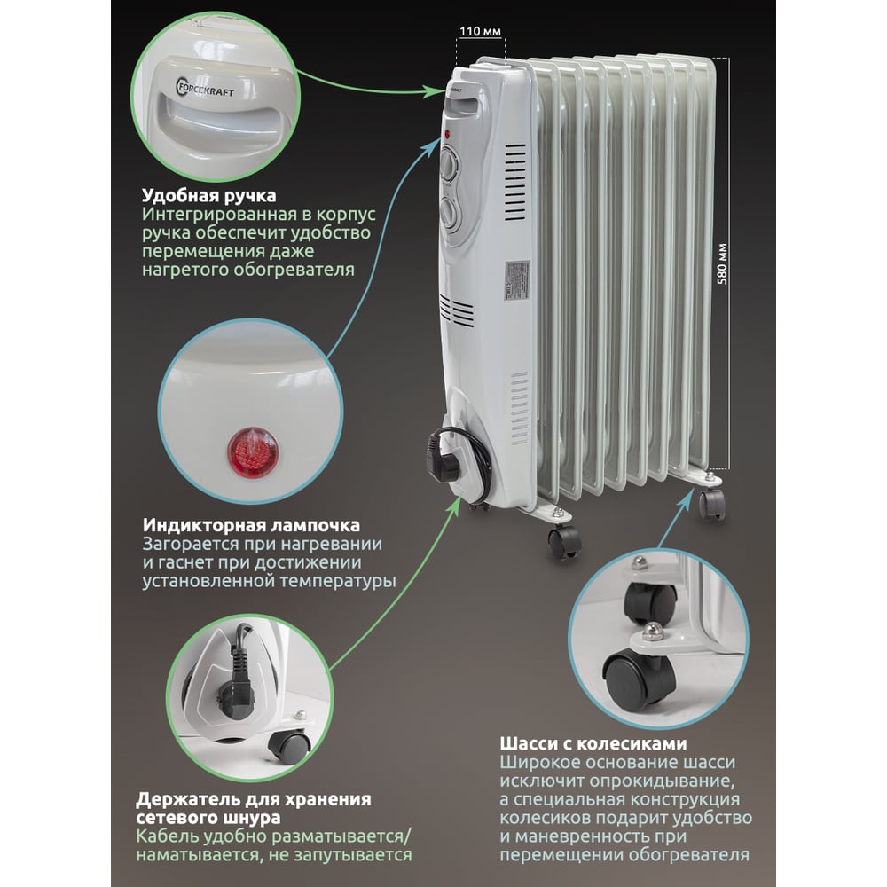 Радиатор масляный электрический Forcekraft (220-240v,50/60гц,2000вт,9 секций 15x58см,3 режима нагрева,защ. от перегрева,40.5x24x62.5см) FK-YL-B08-9(52331)