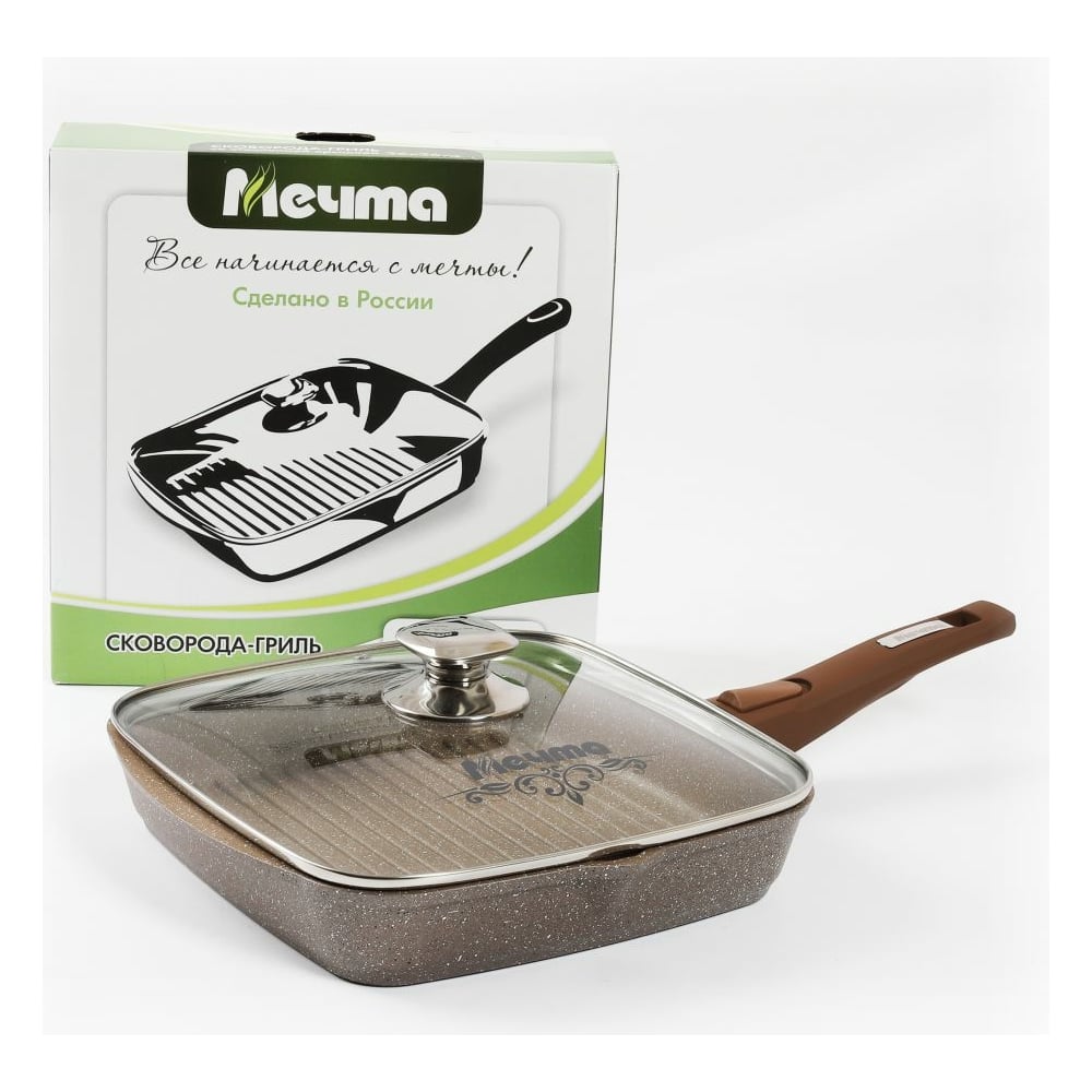 Сковорода гриль Мечта Гранит brown 24 см, со съемной ручкой и стеклянной крышкой с064806
