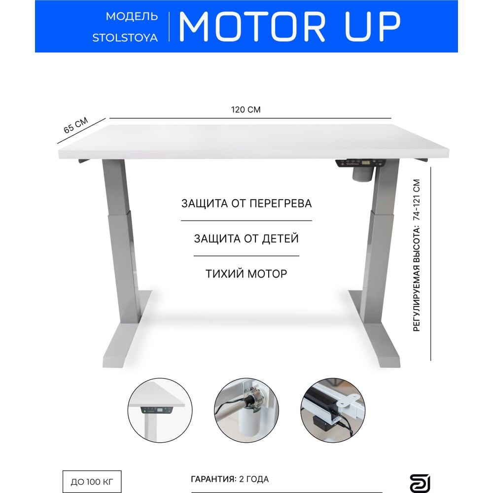 Стол StolStoya МОТОР UP с регулируемой высотой подстолье серое и столешница МДФ эмаль белая 120x65 SE211ISW12065