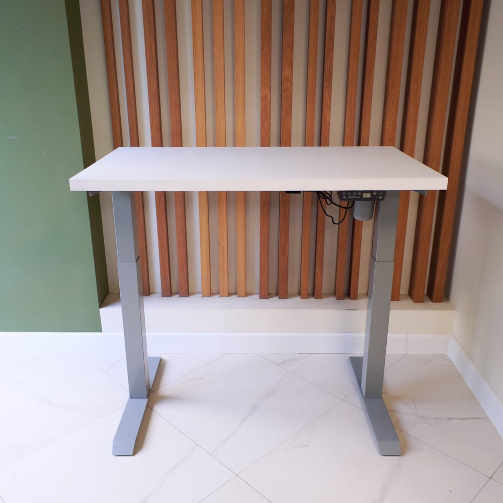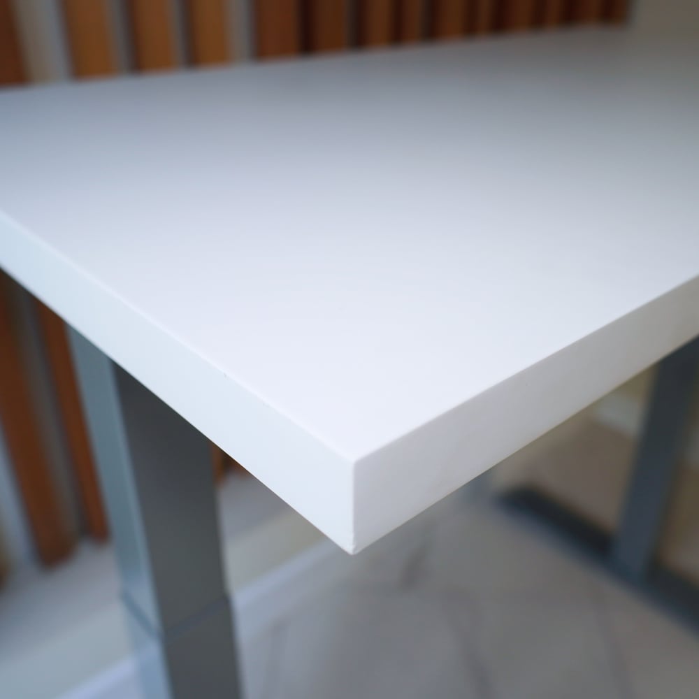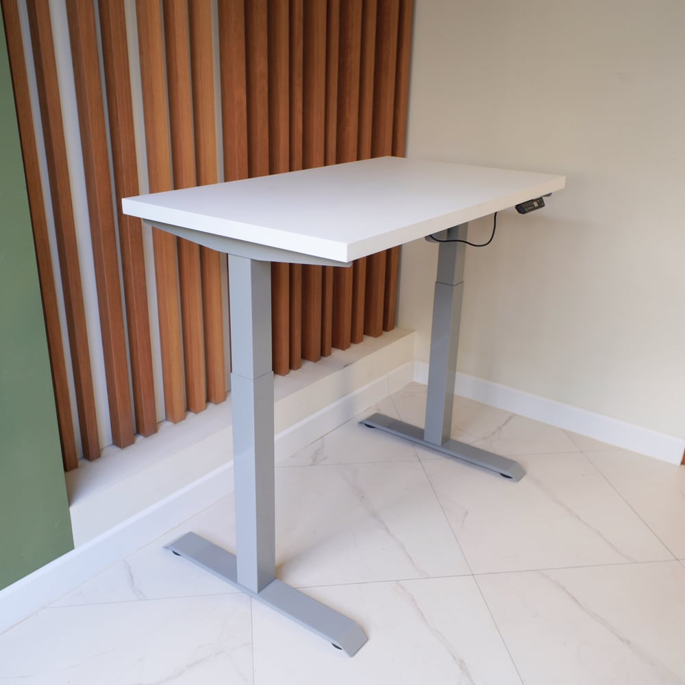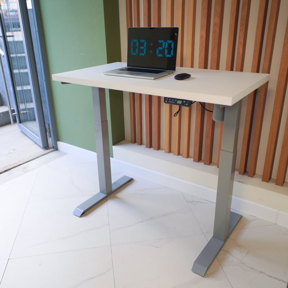 Стол StolStoya МОТОР UP с регулируемой высотой подстолье серое и столешница МДФ эмаль белая 140x70 SE211ISW14070