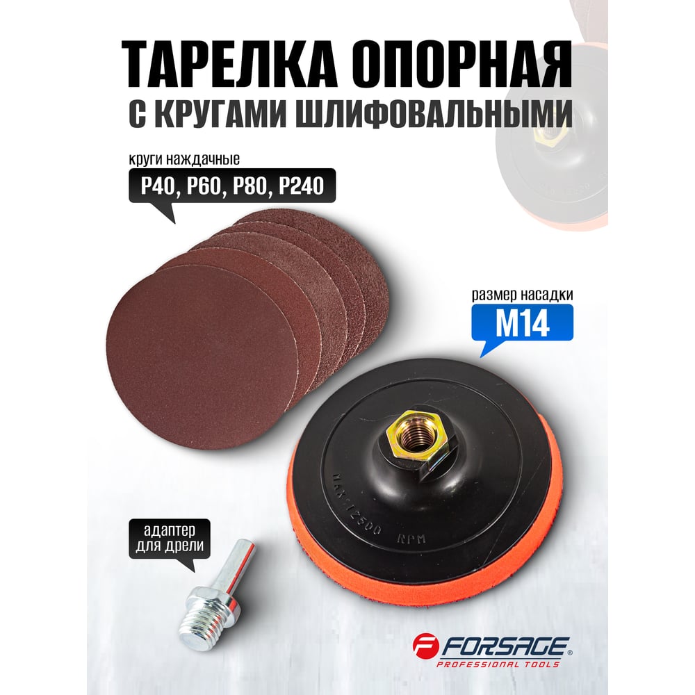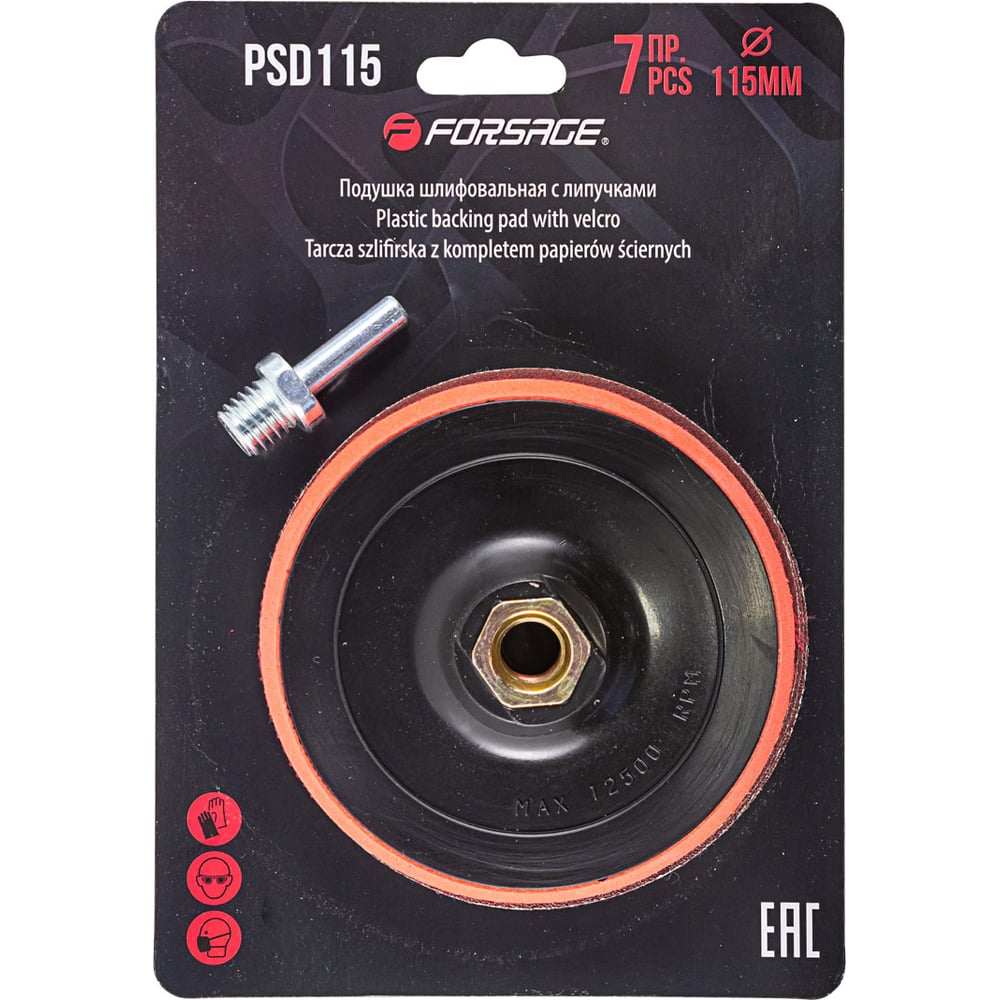 Тарелка опорная для УШМ в комплекте с кругами шлифовальными самоцепляющимися, 7 предметов, 115 мм, М14 + адаптер для дрели Р40/60/80/120/240 Forsage F-PSD115(19740)